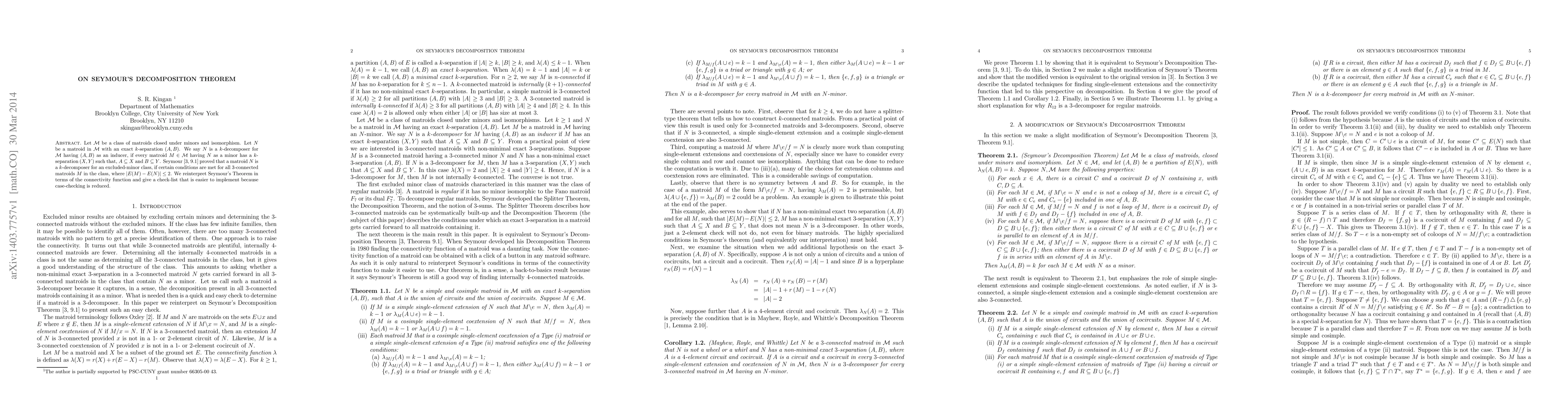Researchers reinterpreted Seymour's Decomposition Theorem to simplify its conditions for 3-connected matroids in a class closed under minors and isomorphism, making it easier to check.