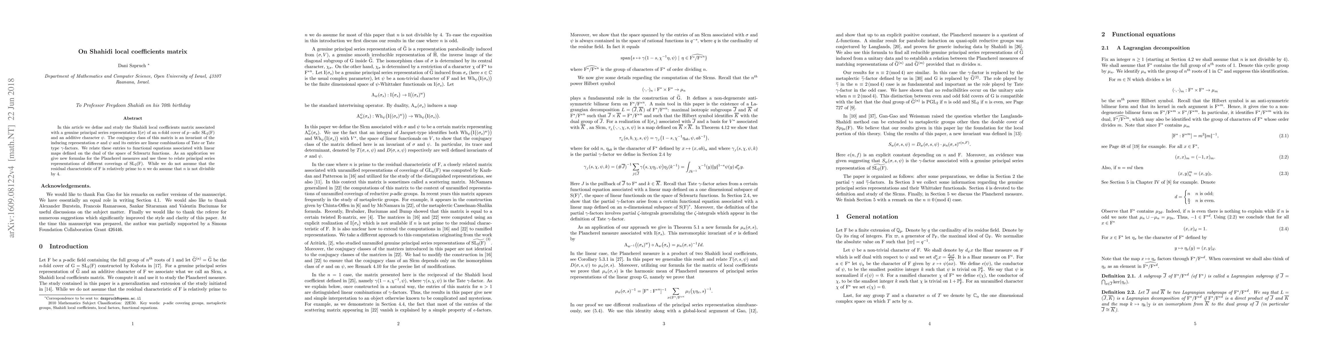 In these notes we define and study the Shahidi local coefficients matrix associated with a genuine principal series representation I({\sigma}) of an n-fold cover of p-adic SL(2,F) and an additive character {\psi}. The conjugacy class of this matrix is an invariant of the inducing representation {\sigma} and {\psi} and its entries are linear combinations of Tate or Tate type {\gamma}-factors. We relate these entries to functional equations associated with linear maps defined on the dual of the space of Schwartz functions. As an application we give new formulas for the Plancherel measure and use these to relate principal series representations of different coverings of SL(2,F). While we do not assume that the residual characteristic of F is relatively prime to n we do assume that n is not divisible by 4.