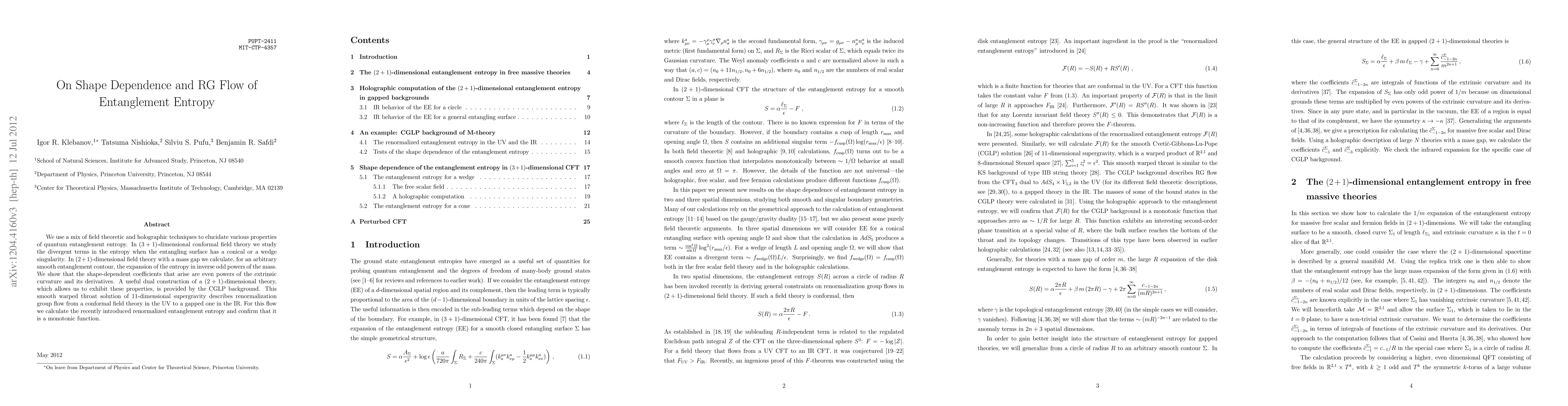 We use a mix of field theoretic and holographic techniques to elucidate various properties of quantum entanglement entropy. In (3+1)-dimensional conformal field theory we study the divergent terms in the entropy when the entangling surface has a conical or a wedge singularity. In (2+1)-dimensional field theory with a mass gap we calculate, for an arbitrary smooth entanglement contour, the expansion of the entropy in inverse odd powers of the mass. We show that the shape-dependent coefficients that arise are even powers of the extrinsic curvature and its derivatives. A useful dual construction of a (2+1)-dimensional theory, which allows us to exhibit these properties, is provided by the CGLP background. This smooth warped throat solution of 11-dimensional supergravity describes renormalization group flow from a conformal field theory in the UV to a gapped one in the IR. For this flow we calculate the recently introduced renormalized entanglement entropy and confirm that it is a monotonic function.