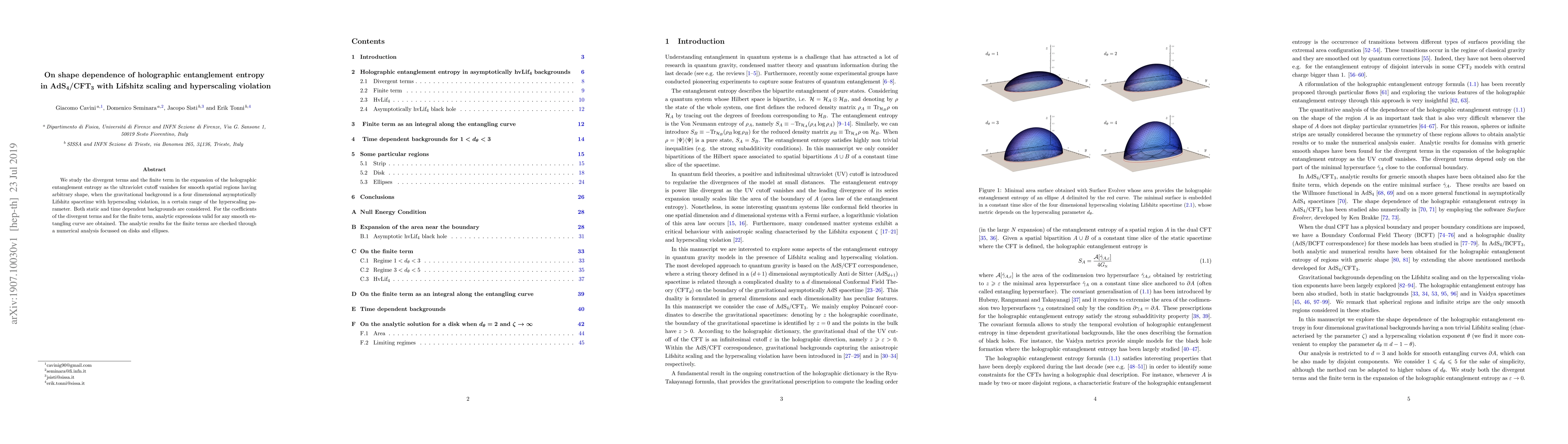 We study the divergent terms and the finite term in the expansion of the holographic entanglement entropy as the ultraviolet cutoff vanishes for smooth spatial regions having arbitrary shape, when the gravitational background is a four dimensional asymptotically Lifshitz spacetime with hyperscaling violation, in a certain range of the hyperscaling parameter. Both static and time dependent backgrounds are considered. For the coefficients of the divergent terms and for the finite term, analytic expressions valid for any smooth entangling curve are obtained. The analytic results for the finite terms are checked through a numerical analysis focussed on disks and ellipses.