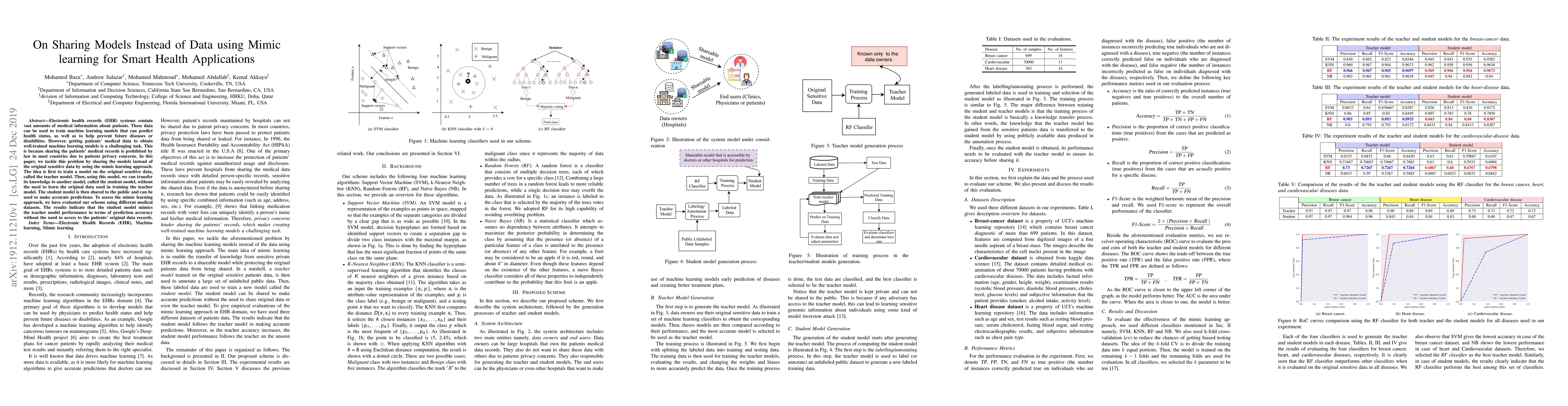 Electronic health records (EHR) systems contain vast amounts of medical information about patients. These data can be used to train machine learning models that can predict health status, as well as to help prevent future diseases or disabilities. However, getting patients' medical data to obtain well-trained machine learning models is a challenging task. This is because sharing the patients' medical records is prohibited by law in most countries due to patients privacy concerns. In this paper, we tackle this problem by sharing the models instead of the original sensitive data by using the mimic learning approach. The idea is first to train a model on the original sensitive data, called the teacher model. Then, using this model, we can transfer its knowledge to another model, called the student model, without the need to learn the original data used in training the teacher model. The student model is then shared to the public and can be used to make accurate predictions. To assess the mimic learning approach, we have evaluated our scheme using different medical datasets. The results indicate that the student model mimics the teacher model performance in terms of prediction accuracy without the need to access to the patients' original data records.