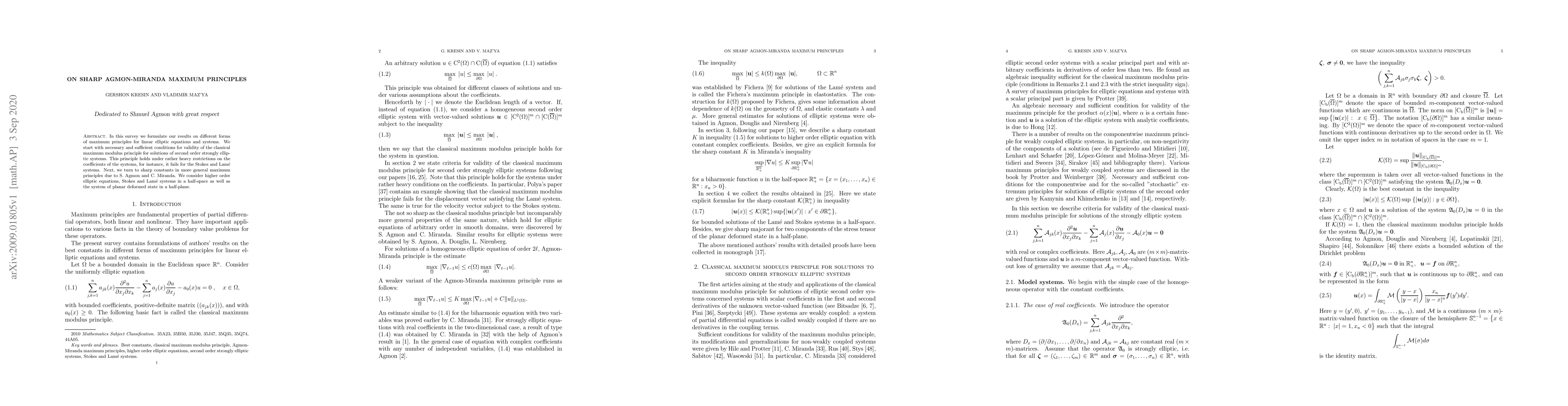 In this survey we formulate our results on different forms of maximum principles for linear elliptic equations and systems. We start with necessary and sufficient conditions for validity of the classical maximum modulus principle for solutions of second order strongly elliptic systems. This principle holds under rather heavy restrictions on the coefficients of the systems, for instance, it fails for the Stokes and Lam\'e systems. Next, we turn to sharp constants in more general maximum principles due to S. Agmon and C. Miranda. We consider higher order elliptic equations, Stokes and Lam\'e systems in a half-space as well as the system of planar deformed state in a half-plane.