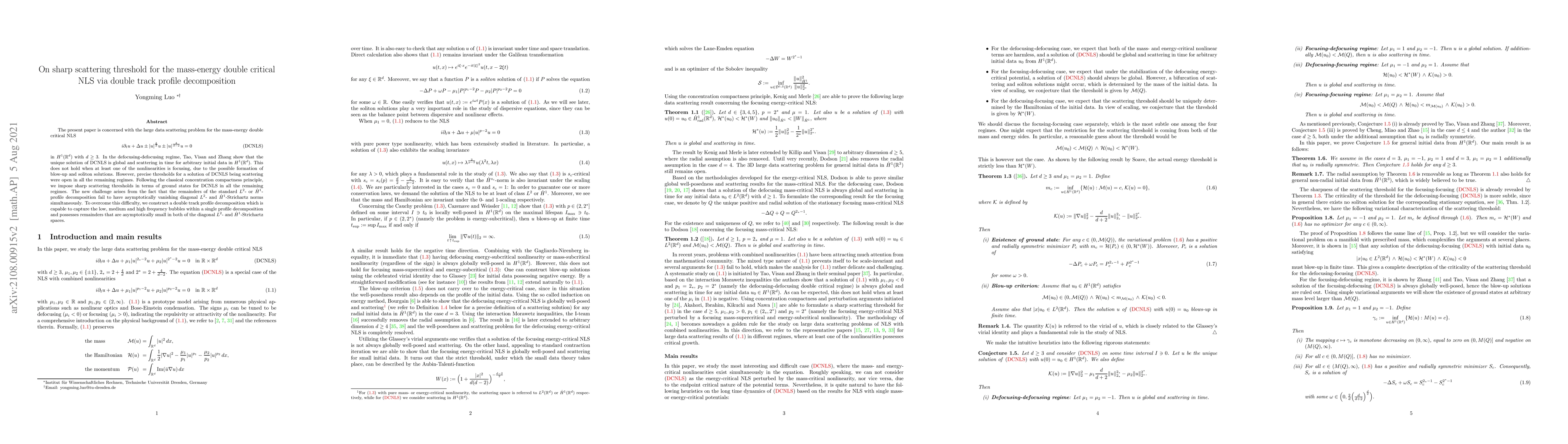 This paper introduces a double track profile decomposition method to establish sharp scattering thresholds for the mass-energy double critical NLS in the defocusing-defocusing and focusing regimes, addressing the limitations of standard profile decompositions in capturing low, medium, and high frequency bubbles simultaneously.