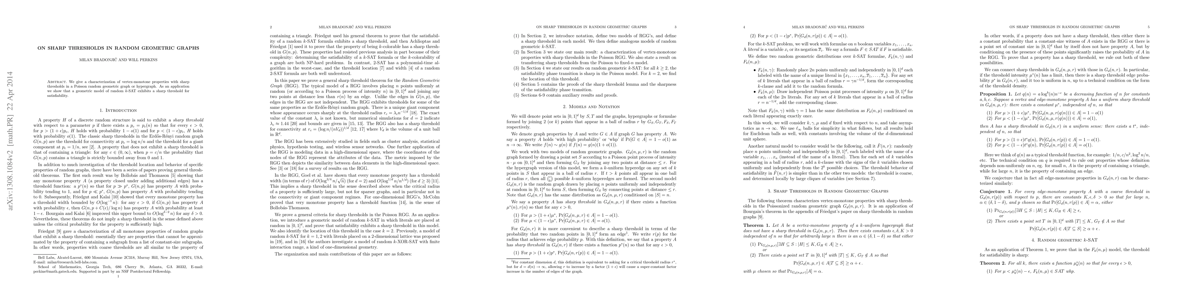 Summary: This paper characterizes vertex-monotone properties with sharp thresholds in Poisson random geometric graphs and hypergraphs. It demonstrates the sharp threshold for satisfiability in a geometric model of random k-SAT.