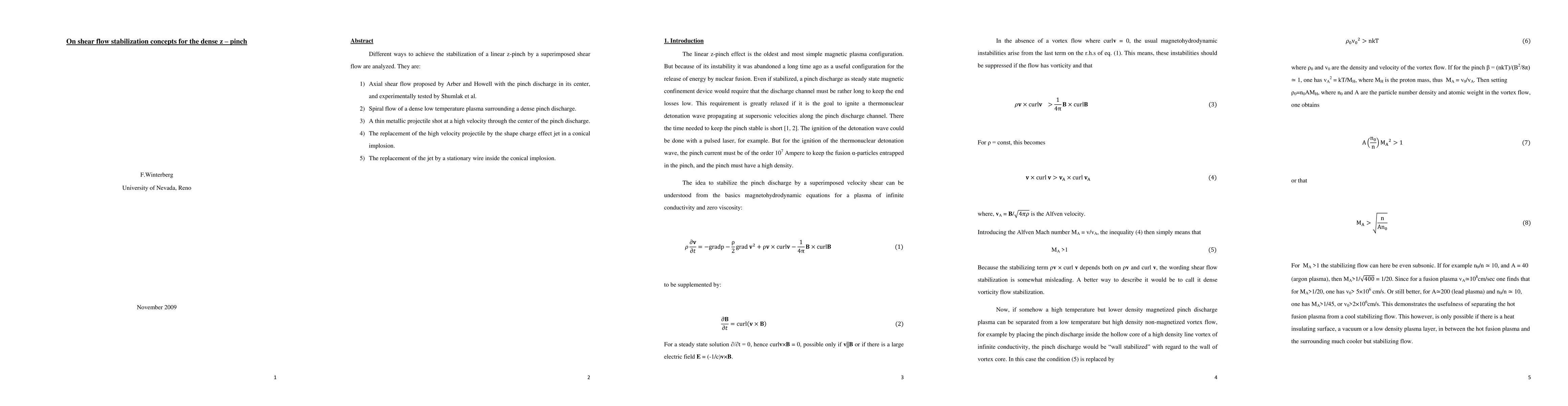 Different ways to achieve the stabilization of a linear z-pinch by a superimposed shear flow are analyzed. They are: 1) Axial shear flow proposed by Arber and Howell with the pinch discharge in its center, and experimentally tested by Shumlak et al. 2) Spiral flow of a dense low temperature plasma surrounding a dense pinch discharge. 3) A thin metallic projectile shot at a high velocity through the center of the pinch discharge. 4) The replacement of the high velocity projectile by the shape charge effect jet in a conical implosion. 5) The replacement of the jet by a stationary wire inside the conical implosion.