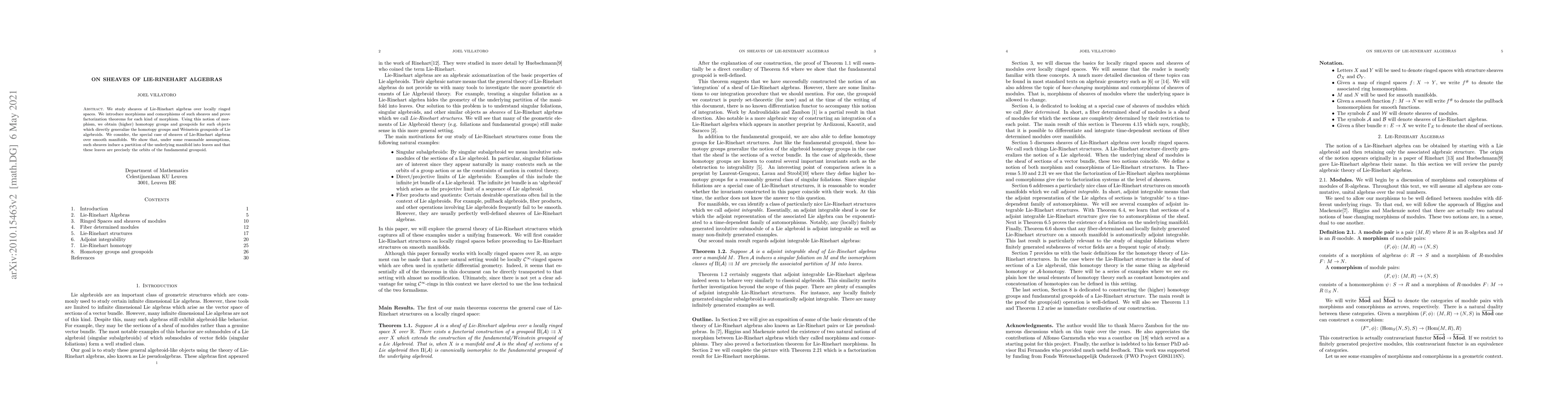 This paper explores sheaves of Lie-Rinehart algebras over locally ringed spaces, introducing morphisms and proving factorization theorems. It generalizes homotopy groups and Weinstein groupoids of Lie algebroids, and considers sheaves over smooth manifolds, showing they partition the manifold into orbit leaves of the fundamental groupoid.