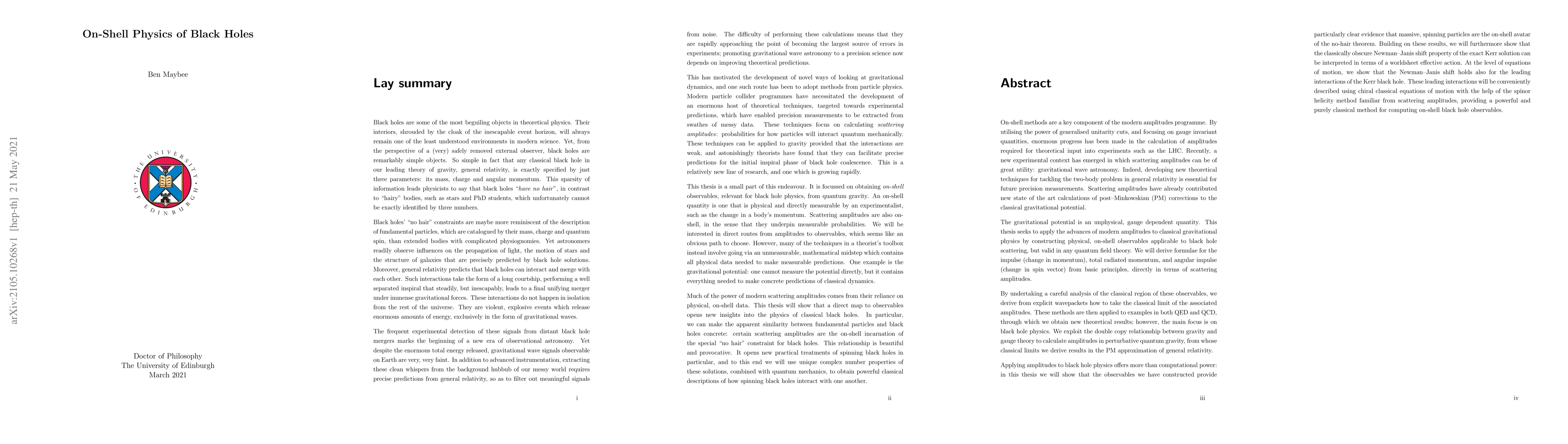 On-shell scattering amplitudes have proven to be useful tools for tackling the two-body problem in general relativity. This thesis outlines how to compute relevant classical observables that are themselves on-shell, directly from amplitudes; examples considered are the momentum impulse, total radiated momentum, and angular impulse for spinning particles. As applications we derive results relevant for black hole physics, computing in the post-Minkowskian expansion of GR, and construct a worldsheet effective action for the leading spin interactions of Kerr black holes.