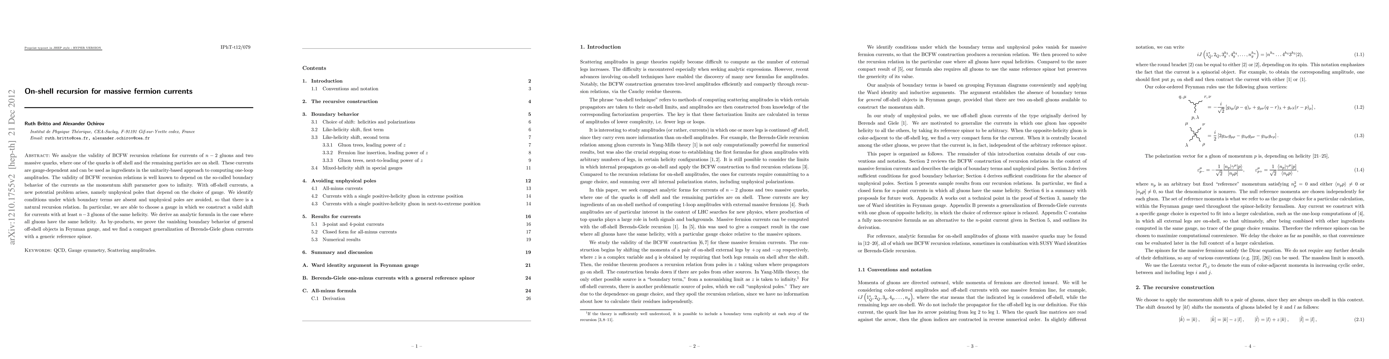 This paper investigates the BCFW recursion relations for massive fermion currents involving off-shell quarks and on-shell gluons, revealing conditions to avoid unphysical poles and ensuring a valid recursion. It establishes a gauge-dependent analytic formula for same-helicity gluons.