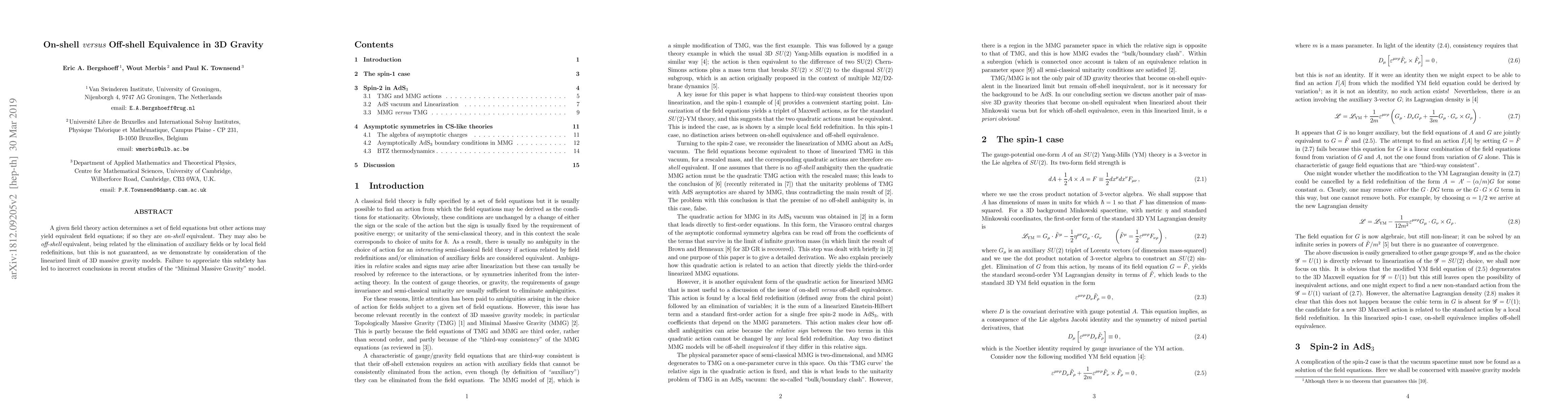 A given field theory action determines a set of field equations but other actions may yield equivalent field equations; if so they are on-shell equivalent. They may also be off-shell equivalent, being related by the elimination of auxiliary fields or by local field redefinitions, but this is not guaranteed, as we demonstrate by consideration of the linearized limit of 3D massive gravity models. Failure to appreciate this subtlety has led to incorrect conclusions in recent studies of the "Minimal Massive Gravity" model.
