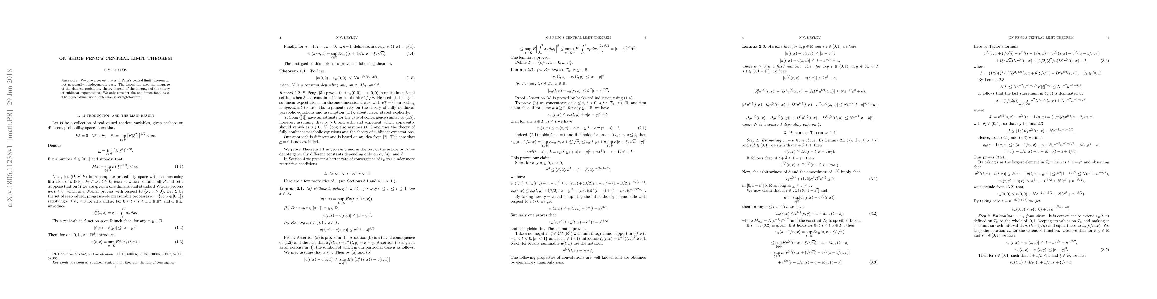 This paper provides error estimates for Shige Peng's central limit theorem in the one-dimensional case, using classical probability theory, with implications for its applicability to non-degenerate cases.