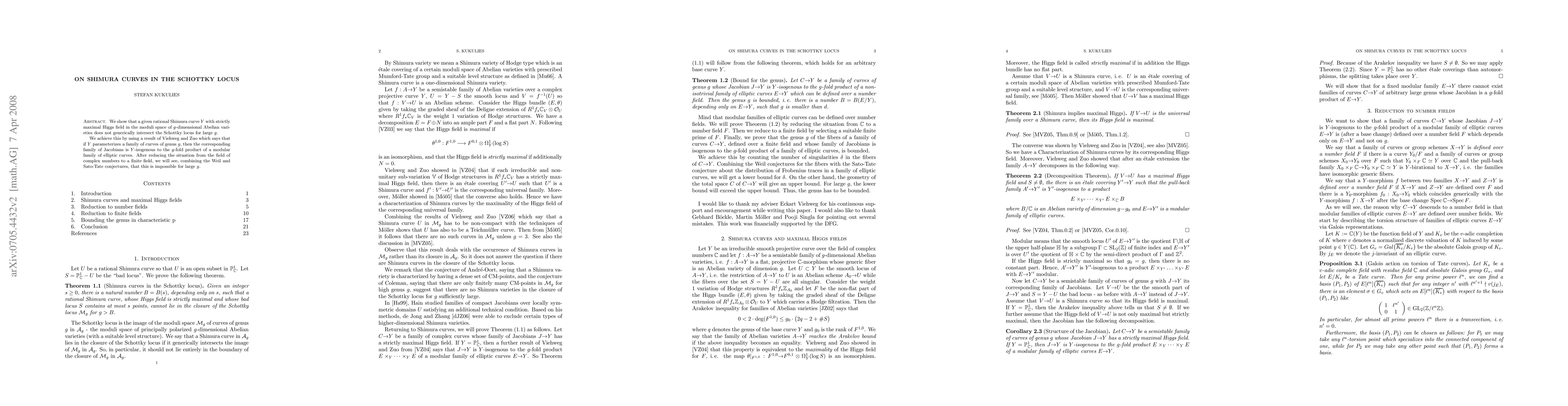 We show that a given rational Shimura curve Y with strictly maximal Higgs field in the moduli space of g-dimensional abelian varieties does not generically intersect the Schottky locus for large g. We achieve this by using a result of Viehweg and Zuo which says that if Y parameterizes a family of curves of genus g, then the corresponding family of Jacobians is isogenous over Y to the g-fold product of a modular family of elliptic curves. After reducing the situation from the field of complex numbers to a finite field, we will see, combining the Weil and Sato-Tate conjectures, that this is impossible for large genus g.