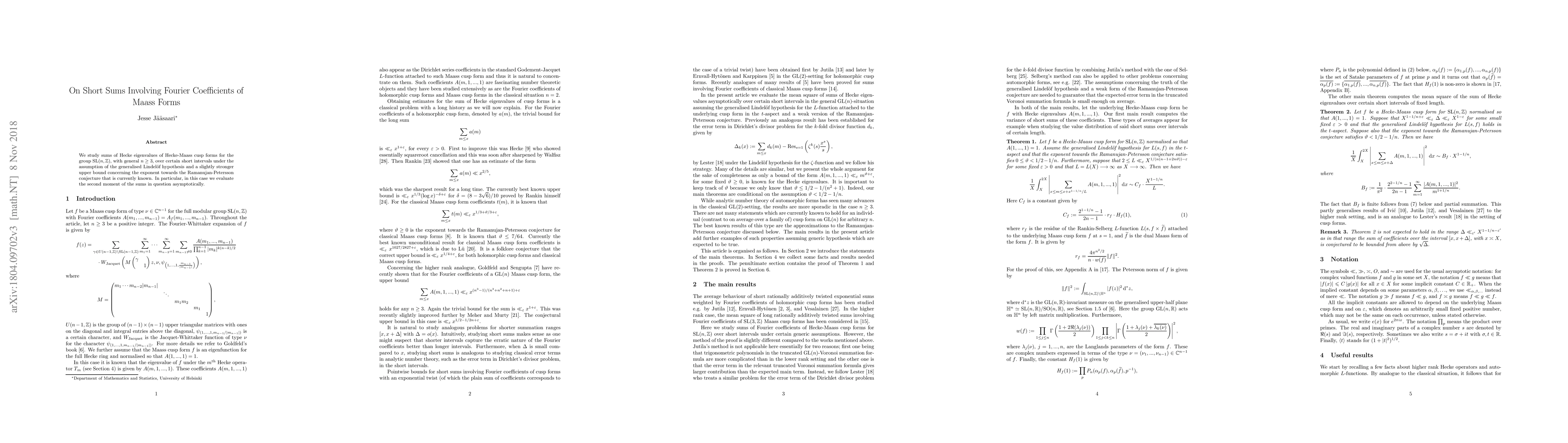 This research paper studies the sums of Fourier coefficients of Maass forms for SL(n,Z) under certain assumptions, focusing on the second moment of these sums asymptotically.