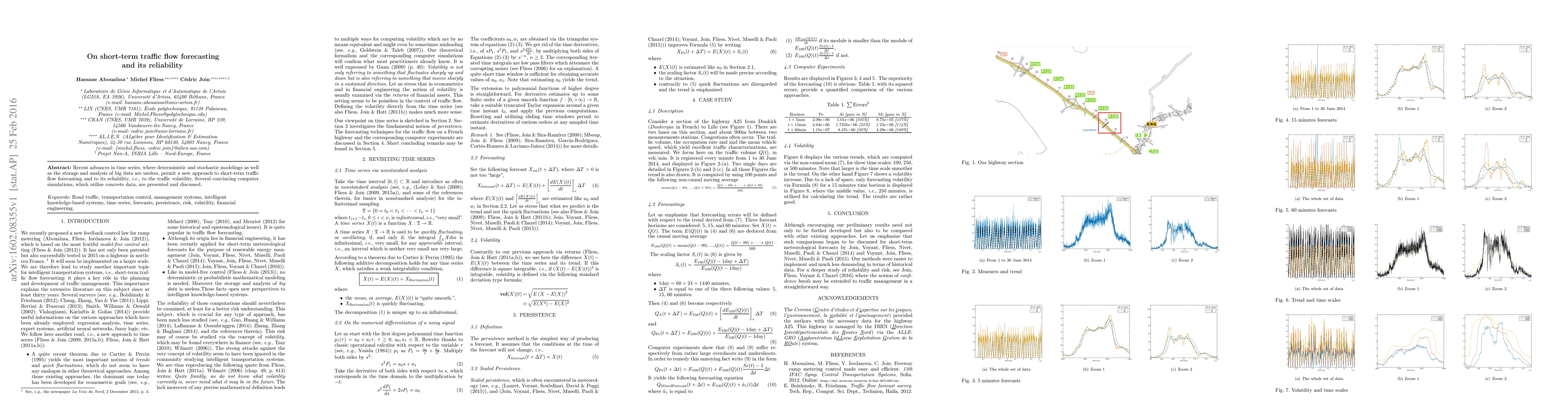 Recent advances in time series, where deterministic and stochastic modelings as well as the storage and analysis of big data are useless, permit a new approach to short-term traffic flow forecasting and to its reliability, i.e., to the traffic volatility. Several convincing computer simulations, which utilize concrete data, are presented and discussed.