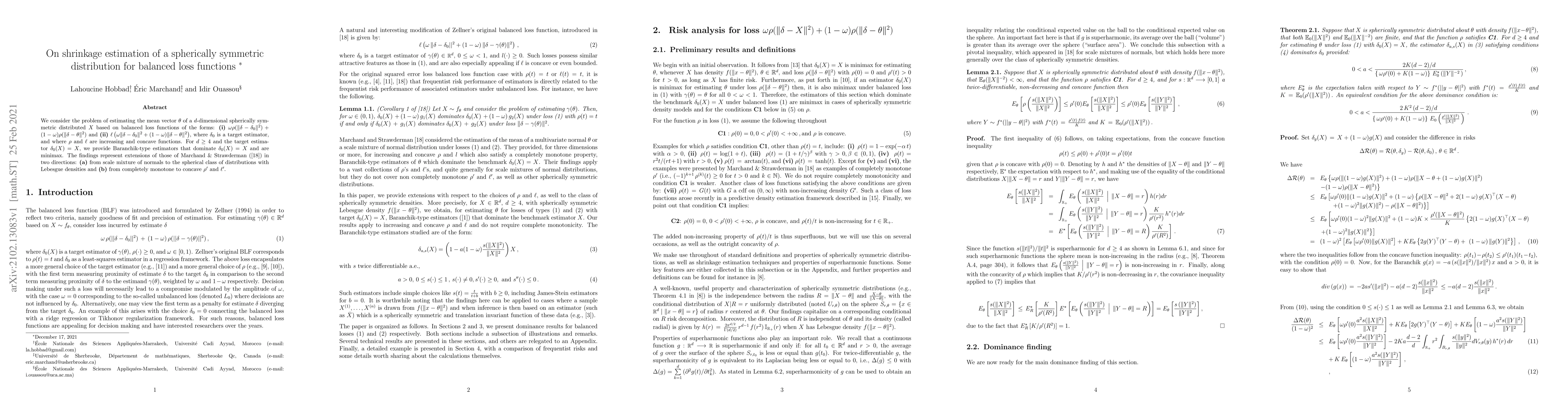We consider the problem of estimating the mean vector $\theta$ of a $d$-dimensional spherically symmetric distributed $X$ based on balanced loss functions of the forms: {\bf (i)} $\omega \rho(\|\de-\de_{0}\|^{2}) +(1-\omega)\rho(\|\de - \theta\|^{2})$ and {\bf (ii)} $\ell\left(\omega \|\de - \de_{0}\|^{2} +(1-\omega)\|\de - \theta\|^{2}\right)$, where $\delta_0$ is a target estimator, and where $\rho$ and $\ell$ are increasing and concave functions. For $d\geq 4$ and the target estimator $\delta_0(X)=X$, we provide Baranchik-type estimators that dominate $\delta_0(X)=X$ and are minimax. The findings represent extensions of those of Marchand \& Strawderman (\cite{ms2020}) in two directions: {\bf (a)} from scale mixture of normals to the spherical class of distributions with Lebesgue densities and {\bf (b)} from completely monotone to concave $\rho'$ and $\ell'$.