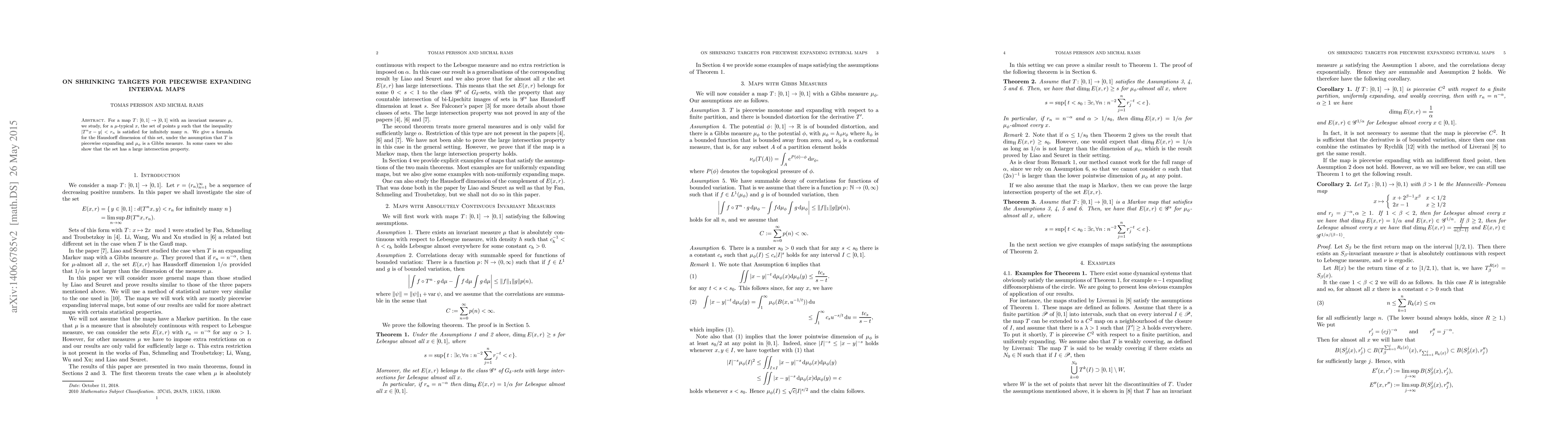 For a map $T \colon [0,1] \to [0,1]$ with an invariant measure $\mu$, we study, for a $\mu$-typical $x$, the set of points $y$ such that the inequality $|T^n x - y| < r_n$ is satisfied for infinitely many $n$. We give a formula for the Hausdorff dimension of this set, under the assumption that $T$ is piecewise expanding and $\mu_\phi$ is a Gibbs measure. In some cases we also show that the set has a large intersection property.
