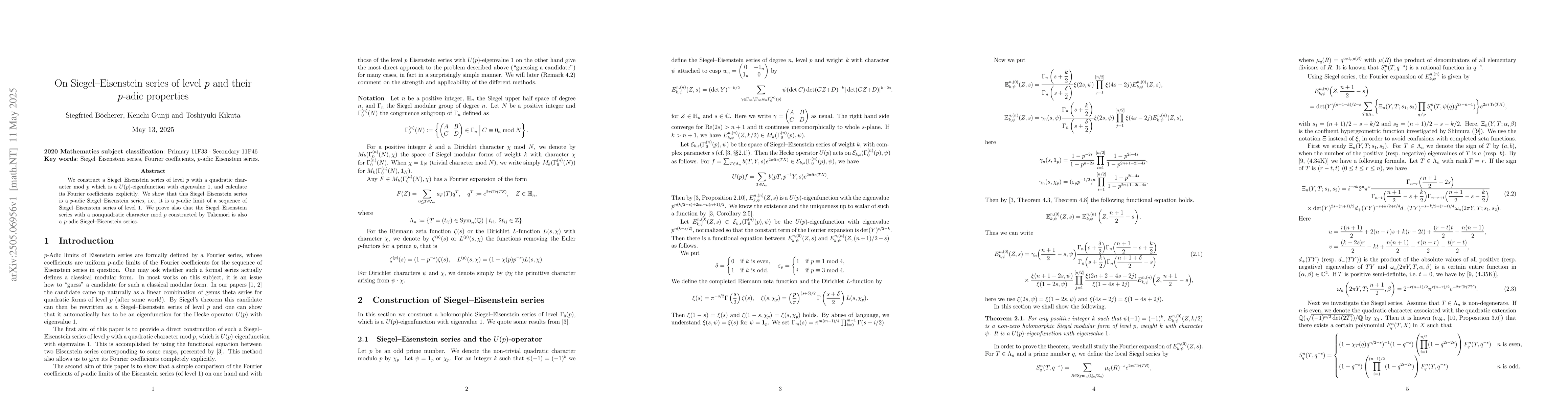 Researchers construct a new Siegel-Eisenstein series of level p with a quadratic character mod p that is a U(p)-eigenfunction with eigenvalue 1, showing it is a p-adic limit of a sequence of such series.