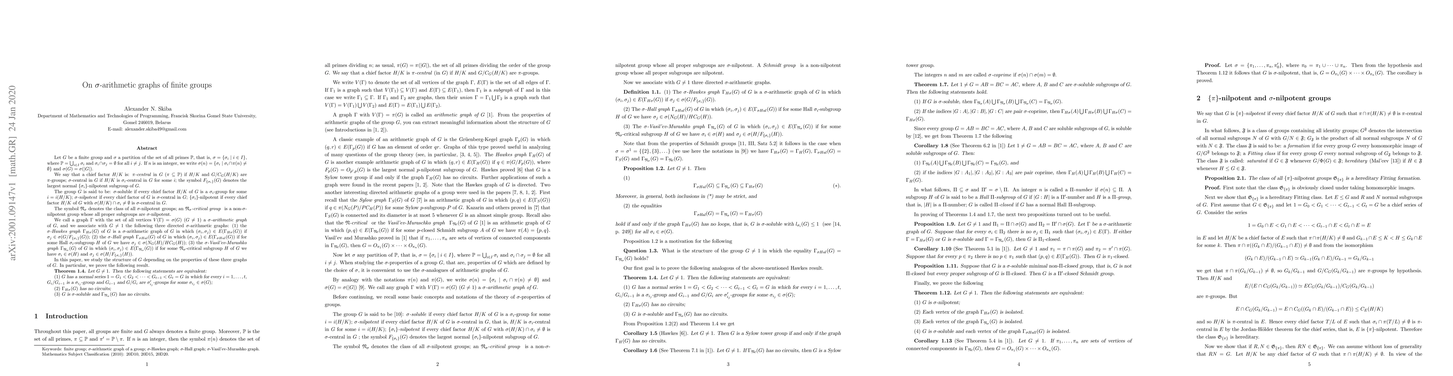 Let $G$ be a finite group and $\sigma$ a partition of the set of all? primes $\Bbb{P}$, that is, $\sigma =\{\sigma_i \mid i\in I \}$, where $\Bbb{P}=\bigcup_{i\in I} \sigma_i$ and $\sigma_i\cap \sigma_j= \emptyset $ for all $i\ne j$. If $n$ is an integer, we write $\sigma(n)=\{\sigma_i \mid \sigma_{i}\cap \pi (n)\ne \emptyset \}$ and $\sigma (G)=\sigma (|G|)$. We call a graph $\Gamma$ with the set of all vertices $V(\Gamma)=\sigma (G)$ ($G\ne 1$) a $\sigma$-arithmetic graph of $G$, and we associate with $G\ne 1$ the following three directed $\sigma$-arithmetic graphs: (1) the $\sigma$-Hawkes graph $\Gamma_{H\sigma }(G)$ of $G$ is a $\sigma$-arithmetic graph of $G$ in which $(\sigma_i, \sigma_j)\in E(\Gamma_{H\sigma }(G))$ if $\sigma_j\in \sigma (G/F_{\{\sigma_i\}}(G))$; (2) the $\sigma$-Hall graph $\Gamma_{\sigma Hal}(G)$ of $G$ in which $(\sigma_i, \sigma_j)\in E(\Gamma_{\sigma Hal}(G))$ if for some Hall $\sigma_i$-subgroup $H$ of $G$ we have $\sigma_j\in \sigma (N_{G}(H)/HC_{G}(H))$; (3) the $\sigma$-Vasil'ev-Murashko graph $\Gamma_{{\mathfrak{N}_\sigma }}(G)$ of $G$ in which $(\sigma_i, \sigma_j)\in E(\Gamma_{{\mathfrak{N}_\sigma}}(G))$ if for some ${\mathfrak{N}_{\sigma }}$-critical subgroup $H$ of $G$ we have $\sigma_i \in \sigma (H)$ and $\sigma_j\in \sigma (H/F_{\{\sigma_i\}}(H))$. In this paper, we study the structure of $G$ depending on the properties of these three graphs of $G$.