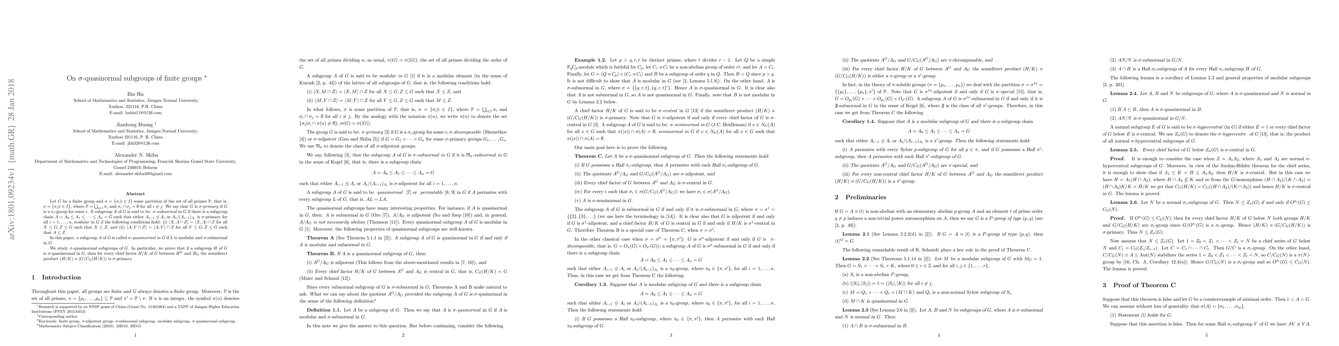 Let $G$ be a finite group and $\sigma =\{\sigma_{i} | i\in I\}$ some partition of the set of all primes $\Bbb{P}$, that is, $\sigma =\{\sigma_{i} | i\in I \}$, where $\Bbb{P}=\bigcup_{i\in I} \sigma_{i}$ and $\sigma_{i}\cap \sigma_{j}= \emptyset $ for all $i\ne j$. We say that $G$ is $\sigma$-primary if $G$ is a $\sigma _{i}$-group for some $i$. A subgroup $A$ of $G$ is said to be: ${\sigma}$-subnormal in $G$ if there is a subgroup chain $A=A_{0} \leq A_{1} \leq \cdots \leq A_{n}=G$ such that either $A_{i-1}\trianglelefteq A_{i}$ or $A_{i}/(A_{i-1})_{A_{i}}$ is $\sigma$-primary for all $i=1, \ldots, n$, modular in $G$ if the following conditions hold: (i) $\langle X, A \cap Z \rangle=\langle X, A \rangle \cap Z$ for all $X \leq G, Z \leq G$ such that $X \leq Z$, and (ii) $\langle A, Y \cap Z \rangle=\langle A, Y \rangle \cap Z$ for all $Y \leq G, Z \leq G$ such that $A \leq Z$. In this paper, a subgroup $A$ of $G$ is called $\sigma$-quasinormal in $G$ if $L$ is modular and ${\sigma}$-subnormal in $G$. We study $\sigma$-quasinormal subgroups of $G$. In particular, we prove that if a subgroup $H$ of $G$ is $\sigma$-quasinormal in $G$, then for every chief factor $H/K$ of $G$ between $H^{G}$ and $H_{G}$ the semidirect product $(H/K)\rtimes (G/C_{G}(H/K))$ is $\sigma$-primary.
