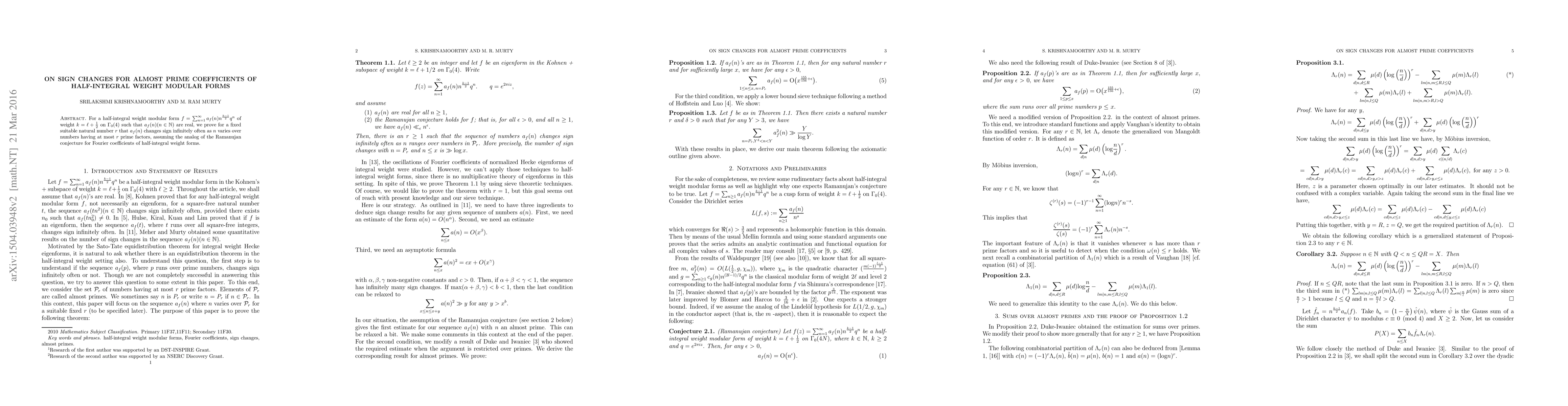 This paper proves that the coefficients of a half-integral weight modular form of weight $k = l +\frac{1}{2}$ on $\Gamma_0(4)$ change sign infinitely often for numbers with at most $r$ prime factors, assuming the Ramanujan conjecture for these forms holds. This result extends sign change properties to almost prime coefficients.