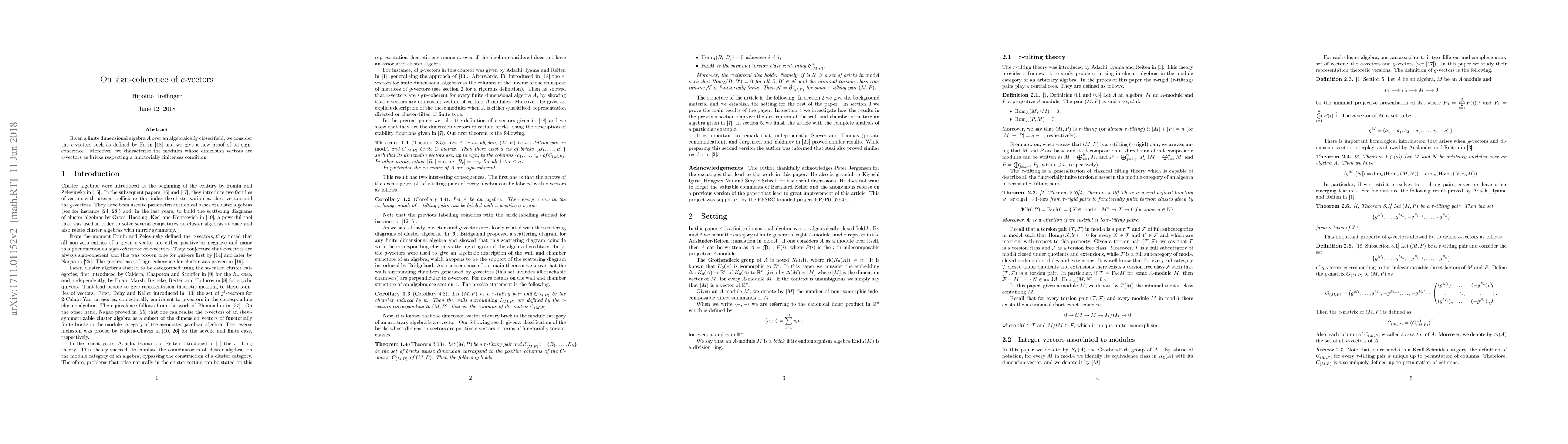 This paper proves the sign-coherence of c-vectors in finite-dimensional algebras over algebraically closed fields, and characterizes modules with c-vector dimension vectors as bricks under a functorially finiteness condition.