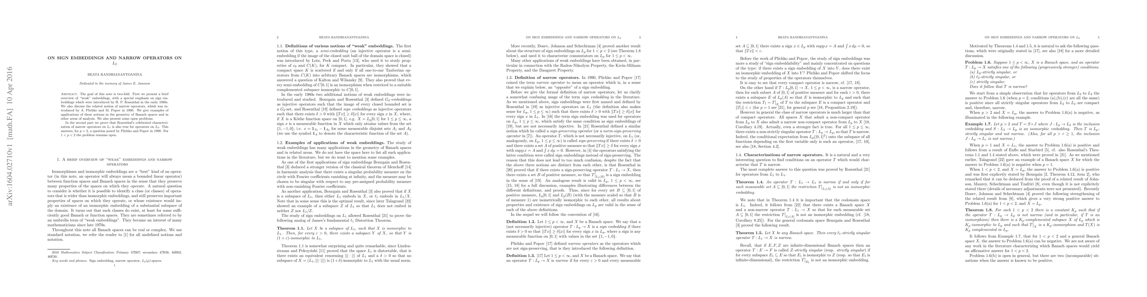 The goal of this note is two-fold. First we present a brief overview of "weak" embeddings, with a special emphasis on sign embeddings which were introduced by H. P. Rosenthal in the early 1980s. We also discuss the related notion of narrow operators, which was introduced by A. Plichko and M. Popov in 1990. We give examples of applications of these notions in the geometry of Banach spaces and in other areas of analysis. We also present some open problems. In the second part we prove that Rosenthal's celebrated characterization of narrow operators on $L_1$ is also true for operators on $L_2$. This answers, for $p=2$, a question posed by Plichko and Popov in 1990. For $1