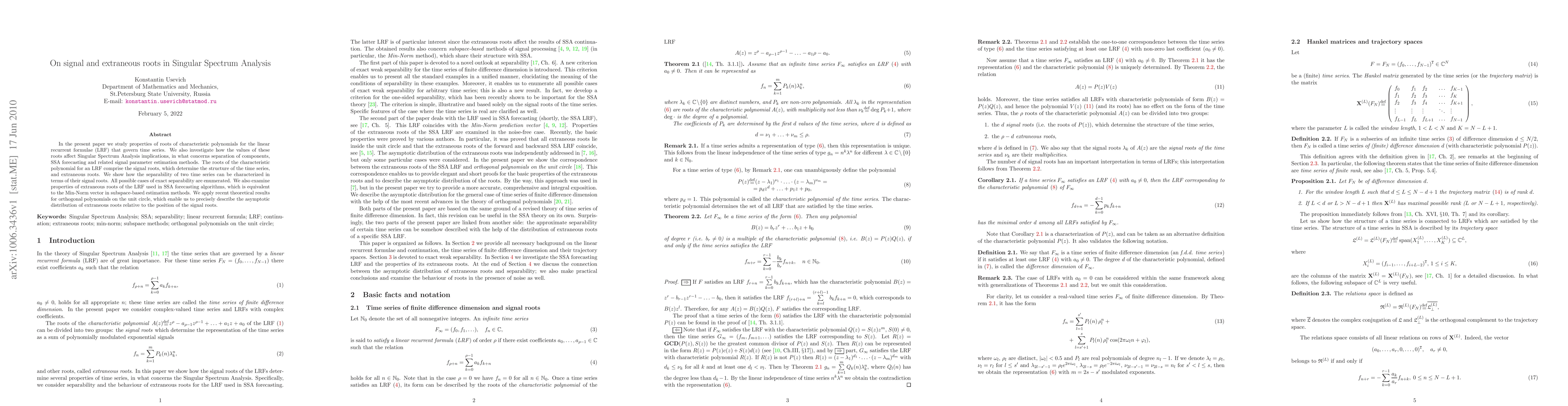 In the present paper we study properties of roots of characteristic polynomials for the linear recurrent formulae (LRF) that govern time series. We also investigate how the values of these roots affect Singular Spectrum Analysis implications, in what concerns separation of components, SSA forecasting and related signal parameter estimation methods. The roots of the characteristic polynomial for an LRF comprise the signal roots, which determine the structure of the time series, and extraneous roots. We show how the separability of two time series can be characterized in terms of their signal roots. All possible cases of exact separability are enumerated. We also examine properties of extraneous roots of the LRF used in SSA forecasting algorithms, which is equivalent to the Min-Norm vector in subspace-based estimation methods. We apply recent theoretical results for orthogonal polynomials on the unit circle, which enable us to precisely describe the asymptotic distribution of extraneous roots relative to the position of the signal roots.