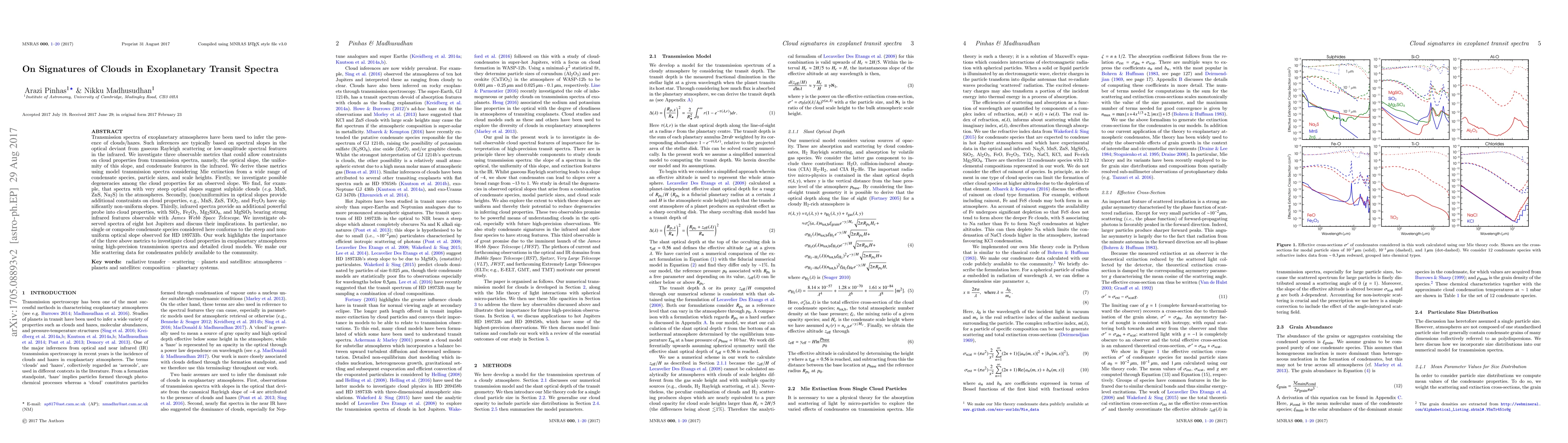 Transmission spectra of exoplanetary atmospheres have been used to infer the presence of clouds/hazes. Such inferences are typically based on spectral slopes in the optical deviant from gaseous Rayleigh scattering or low-amplitude spectral features in the infrared. We investigate three observable metrics that could allow constraints on cloud properties from transmission spectra, namely, the optical slope, the uniformity of this slope, and condensate features in the infrared. We derive these metrics using model transmission spectra considering Mie extinction from a wide range of condensate species, particle sizes, and scale heights. Firstly, we investigate possible degeneracies among the cloud properties for an observed slope. We find, for example, that spectra with very steep optical slopes suggest sulphide clouds (e.g. MnS, ZnS, Na$_2$S) in the atmospheres. Secondly, (non)uniformities in optical slopes provide additional constraints on cloud properties, e.g., MnS, ZnS, TiO$_2$, and Fe$_2$O$_3$ have significantly non-uniform slopes. Thirdly, infrared spectra provide an additional powerful probe into cloud properties, with SiO$_2$, Fe$_2$O$_3$, Mg$_2$SiO$_4$, and MgSiO$_3$ bearing strong infrared features observable with the James Webb Space Telescope. We investigate observed spectra of eight hot Jupiters and discuss their implications. In particular, no single or composite condensate species considered here conforms to the steep and non-uniform optical slope observed for HD 189733b. Our work highlights the importance of the three above metrics to investigate cloud properties in exoplanetary atmospheres using high-precision transmission spectra and detailed cloud models. We make our Mie scattering data for condensates publicly available to the community.
