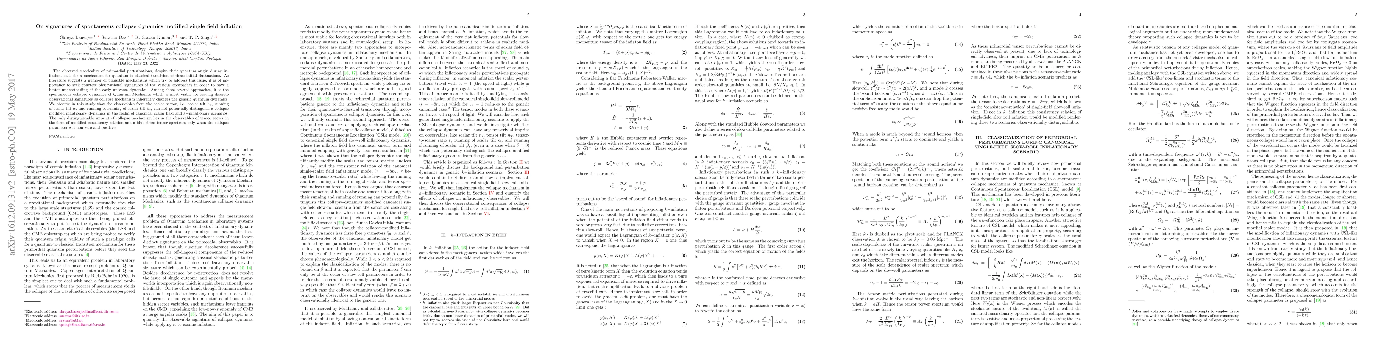 This paper investigates the observational signatures of spontaneous collapse dynamics in modified single field inflation models. It concludes that while scalar observables cannot distinguish these models, tensor sector observables, specifically a modified consistency relation and a blue-tilted tensor spectrum, provide unique signatures when the collapse parameter is non-zero and positive.
