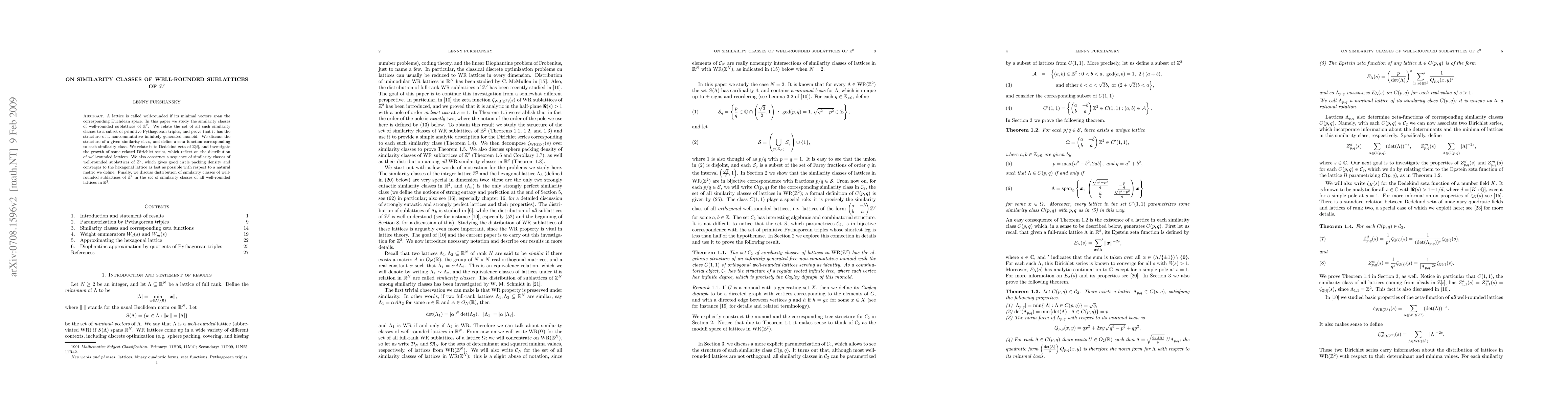 A lattice is called well-rounded if its minimal vectors span the corresponding Euclidean space. In this paper we study the similarity classes of well-rounded sublattices of ${\mathbb Z}^2$. We relate the set of all such similarity classes to a subset of primitive Pythagorean triples, and prove that it has structure of a noncommutative infinitely generated monoid. We discuss the structure of a given similarity class, and define a zeta function corresponding to each similarity class. We relate it to Dedekind zeta of ${\mathbb Z}[i]$, and investigate the growth of some related Dirichlet series, which reflect on the distribution of well-rounded lattices. Finally, we construct a sequence of similarity classes of well-rounded sublattices of ${\mathbb Z}^2$, which gives good circle packing density and converges to the hexagonal lattice as fast as possible with respect to a natural metric we define.