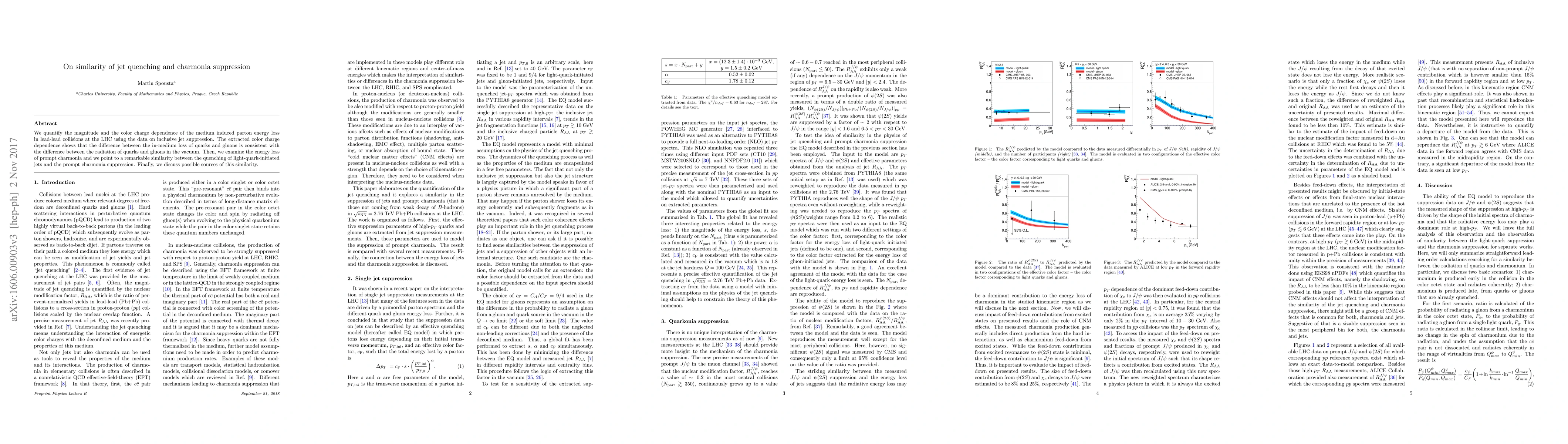 We quantify the magnitude of the parton energy loss in jets in lead-lead collisions at the LHC. We extract the effective color factor characterizing the difference between the in-medium radiation of quark-initiated jets and gluon-initiated jets from the data. Then, we examine the energy loss of prompt charmonia and we point to a remarkable similarity between the quenching of light-quark-initiated jets and the prompt charmonia suppression. Finally, we discuss possible sources of this similarity.