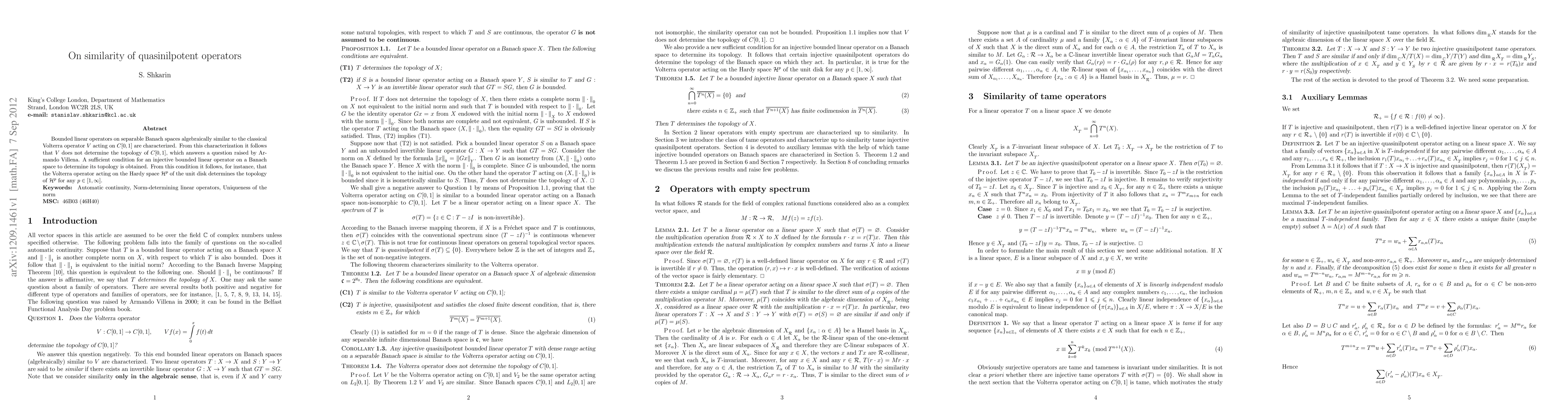 Bounded linear operators on separable Banach spaces algebraically similar to the classical Volterra operator $V$ acting on $C[0,1]$ are characterized. From this characterization it follows that $V$ does not determine the topology of $C[0,1]$, which answers a question raised by Armando Villena. A sufficient condition for an injective bounded linear operator on a Banach space to determine its topology is obtained. From this condition it follows, for instance, that the Volterra operator acting on the Hardy space $\H^p$ of the unit disk determines the topology of $\H^p$ for any $p\in[1,\infty]$.