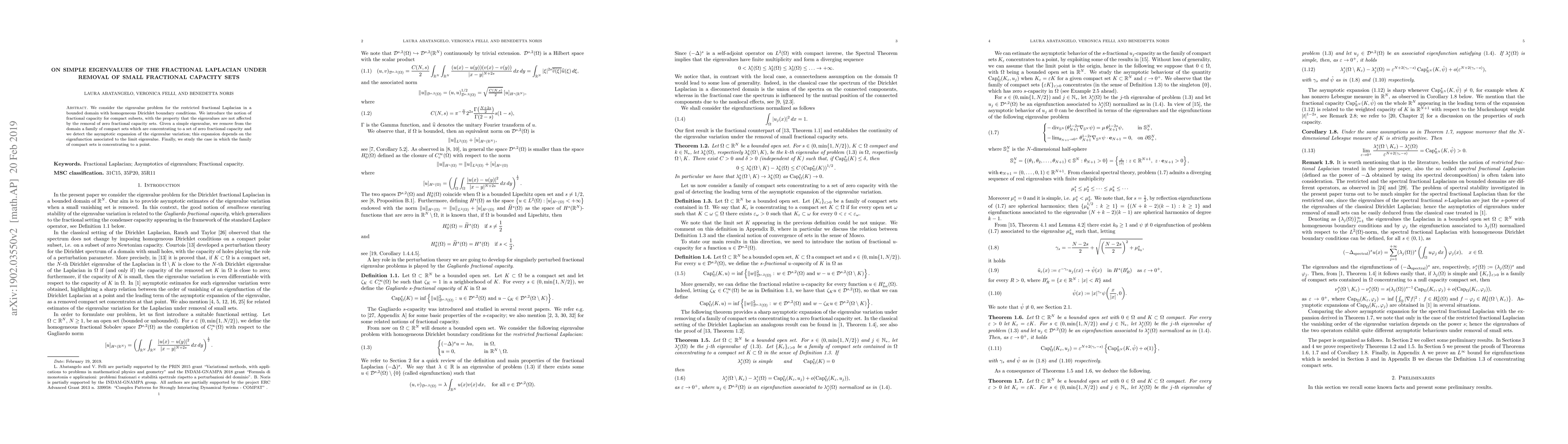 This research explores the eigenvalue problem for a fractional Laplacian in a bounded domain, showing that removing compact sets of zero fractional capacity doesn't affect eigenvalues. It provides an asymptotic expansion for eigenvalue changes when such sets concentrate to a limit, influenced by the associated eigenfunction. The study also examines the scenario where these sets concentrate to a single point.
