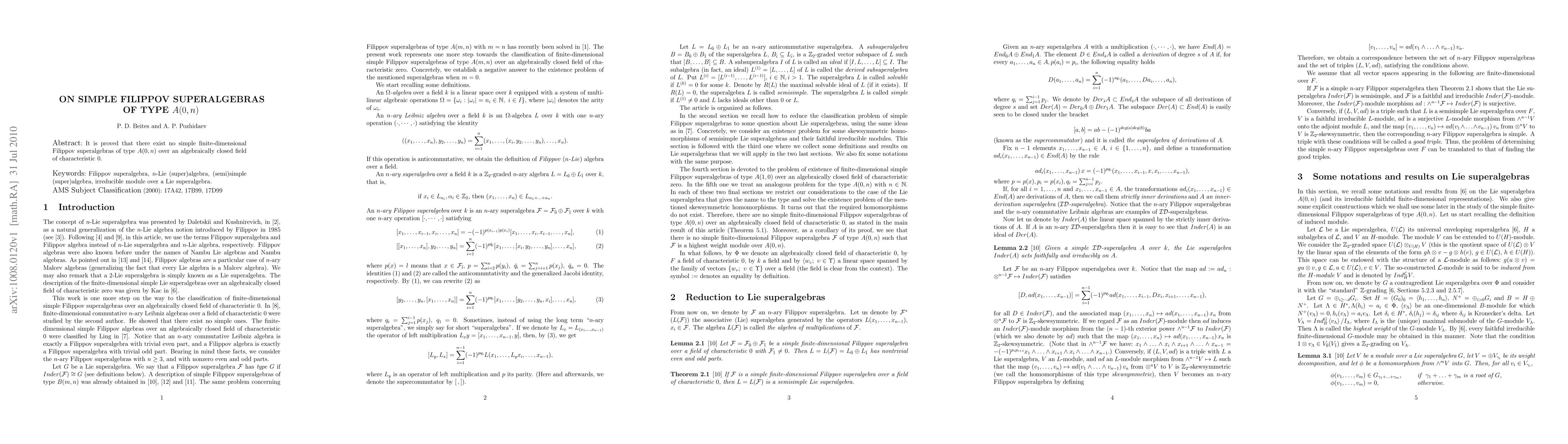 Summary: The paper demonstrates that there are no simple finite-dimensional Filippov superalgebras of type A(0,n) over an algebraically closed field with characteristic 0. This result provides a significant limitation on the structure of such superalgebras.