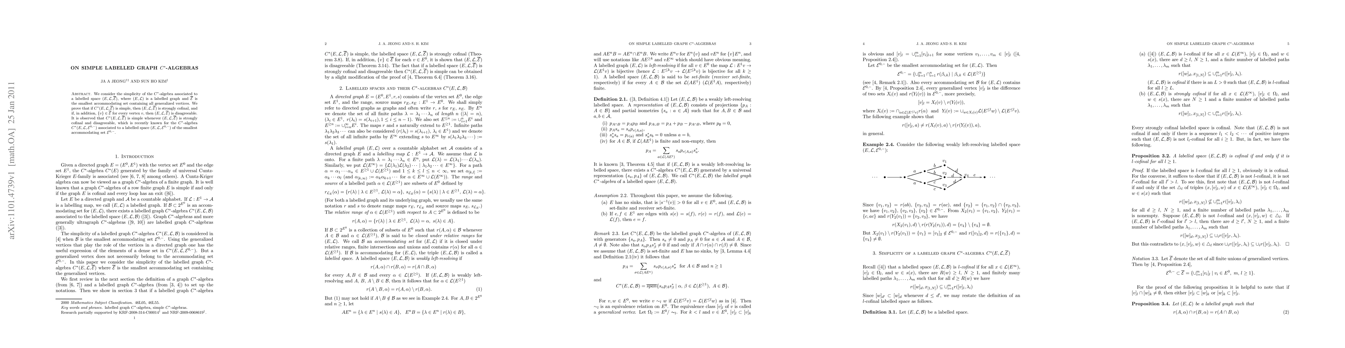 We consider the simplicity of the $C^*$-algebra associated to a labelled space $(E,\CL,\bE)$, where $(E,\CL)$ is a labelled graph and $\bE$ is the smallest accommodating set containing all generalized vertices. We prove that if $C^*(E, \CL, \bE)$ is simple, then $(E, \CL, \bE)$ is strongly cofinal, and if, in addition, $\{v\}\in \bE$ for every vertex $v$, then $(E, \CL, \bE)$ is disagreeable. It is observed that $C^*(E, \CL, \bE)$ is simple whenever $(E, \CL, \bE)$ is strongly cofinal and disagreeable, which is recently known for the $C^*$-algebra $C^*(E, \CL, \CEa)$ associated to a labelled space $(E, \CL, \CEa)$ of the smallest accommodating set $\CEa$.