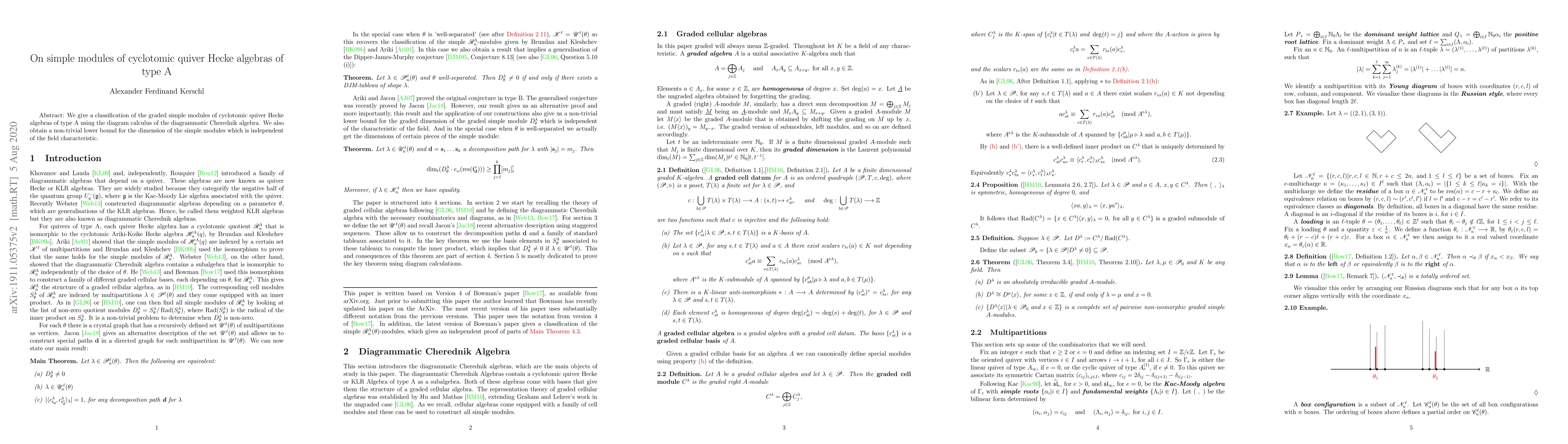 Summary: This paper classifies the graded simple modules of cyclotomic quiver Hecke algebras of type A through the diagram calculus of diagrammatic Cherednik algebras and establishes a lower bound for their dimensions that is characteristic-independent.