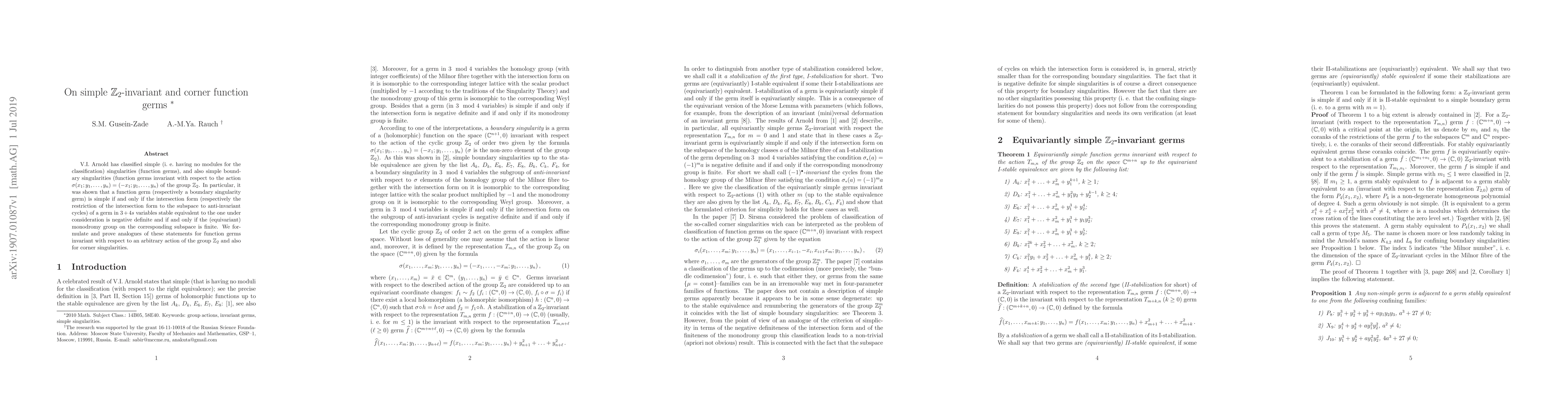 V.I.Arnold has classified simple (i.e. having no modules for the classification) singularities (function germs), and also simple boundary singularities (function germs invariant with respect to the action $\sigma(x_1; y_1, \ldots, y_n)=(-x_1; y_1, \ldots, y_n)$ of the group $Z_2$. In particular, it was shown that a function germ (respectively a boundary singularity germ) is simple if and only if the intersection form (respectively the restriction of the intersection form to the subspace to anti-invariant cycles) of a germ in $3+4s$ variables stable equivalent to the one under consideration is negative definite and if and only if the (equivariant) monodromy group on the corresponding subspace is finite. We formulate and prove analogues of these statements for function germs invariant with respect to an arbitrary action of the group $Z_2$ and also for corner singularities.