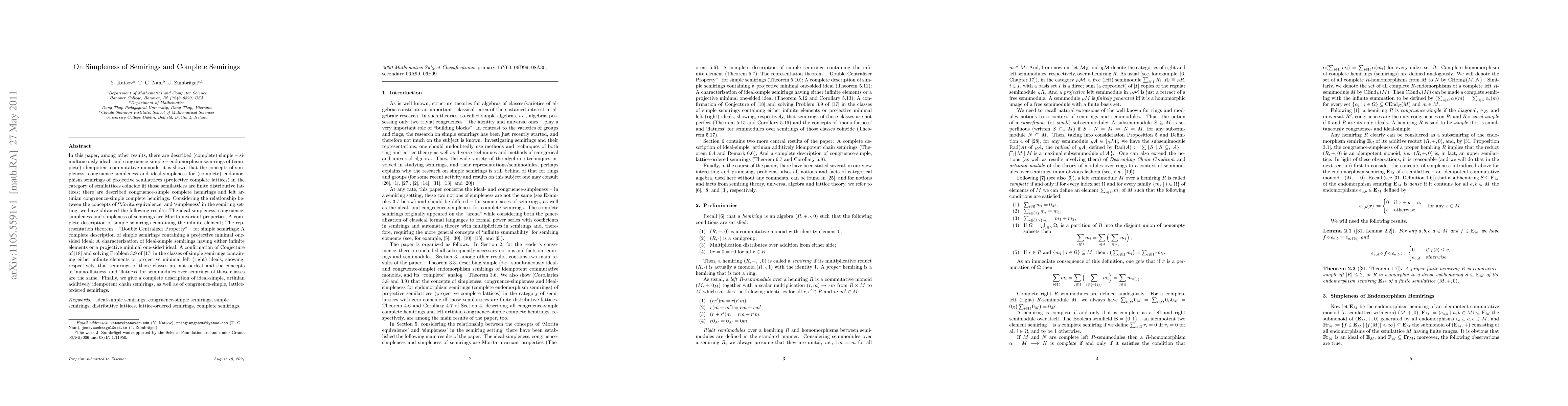 In this paper, among other results, there are described (complete) simple - simultaneously ideal- and congruence-simple - endomorphism semirings of (complete) idempotent commutative monoids; it is shown that the concepts of simpleness, congruence-simpleness and ideal-simpleness for (complete) endomorphism semirings of projective semilattices (projective complete lattices) in the category of semilattices coincide iff those semilattices are finite distributive lattices; there are described congruence-simple complete hemirings and left artinian congruence-simple complete hemirings. Considering the relationship between the concepts of "Morita equivalence" and "simpleness" in the semiring setting, we have obtained the following results: The ideal-simpleness, congruence-simpleness and simpleness of semirings are Morita invariant properties; A complete description of simple semirings containing the infinite element; The representation theorem - "Double Centralizer Property" - for simple semirings; A complete description of simple semirings containing a projective minimal one-sided ideal; A characterization of ideal-simple semirings having either infinite elements or a projective minimal one-sided ideal; A confirmation of Conjecture of [Kat04a] and solving Problem 3.9 of [Kat04b] in the classes of simple semirings containing either infinite elements or projective minimal left (right) ideals, showing, respectively, that semirings of those classes are not perfect and the concepts of "mono-flatness" and "flatness" for semimodules over semirings of those classes are the same. Finally, we give a complete description of ideal-simple, artinian additively idempotent chain semirings, as well as of congruence-simple, lattice-ordered semirings.