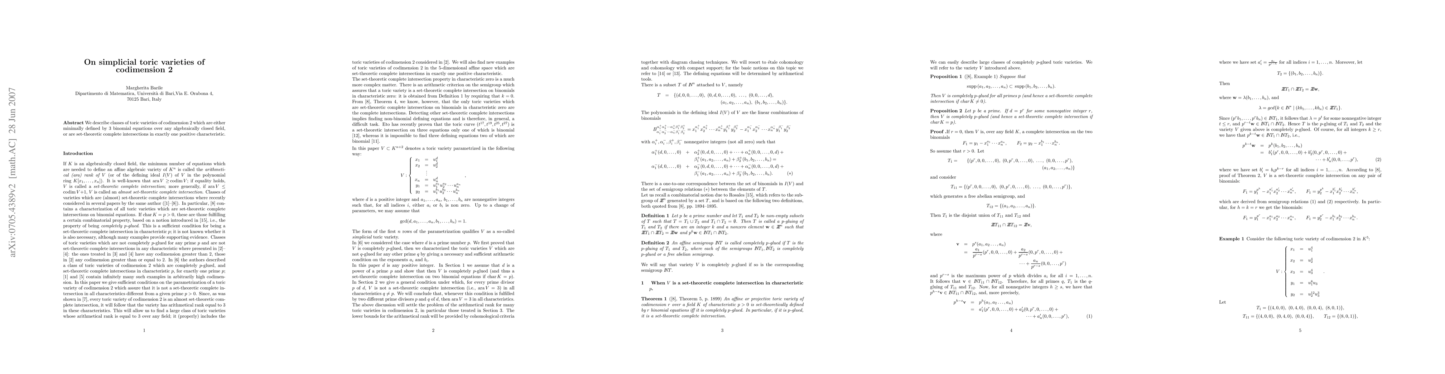 We describe classes of toric varieties of codimension 2 which are either minimally defined by 3 binomial equations over any algebraically closed field, or are set-theoretic complete intersections in exactly one positive characteristic.