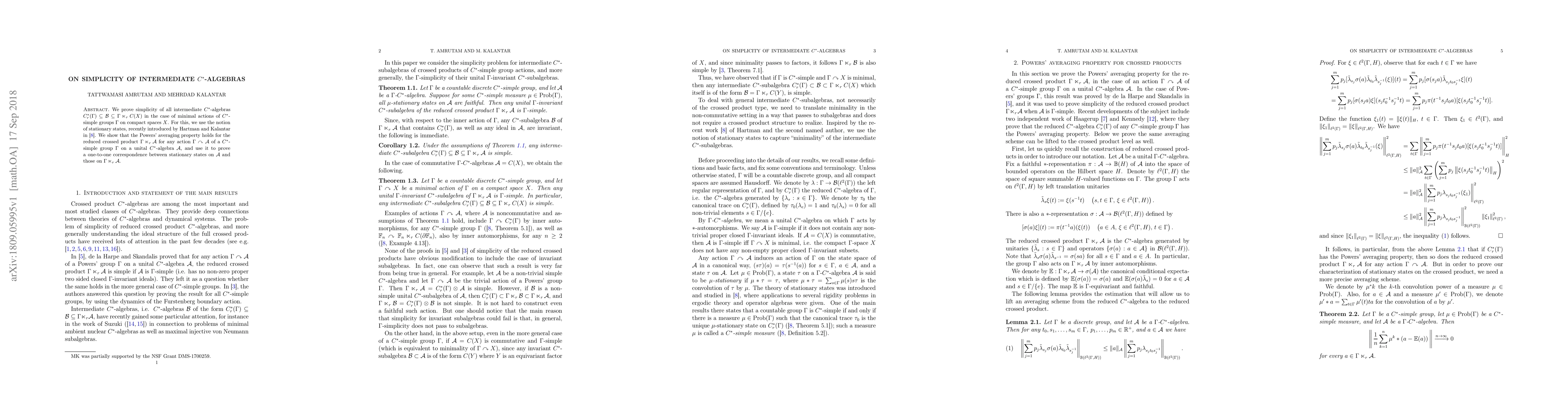 This paper proves the simplicity of all intermediate $C^*$-algebras in the context of minimal actions of $C^*$-simple groups on compact spaces, utilizing the concept of stationary states and Powers' averaging property to establish a correspondence between stationary states in the reduced crossed product.