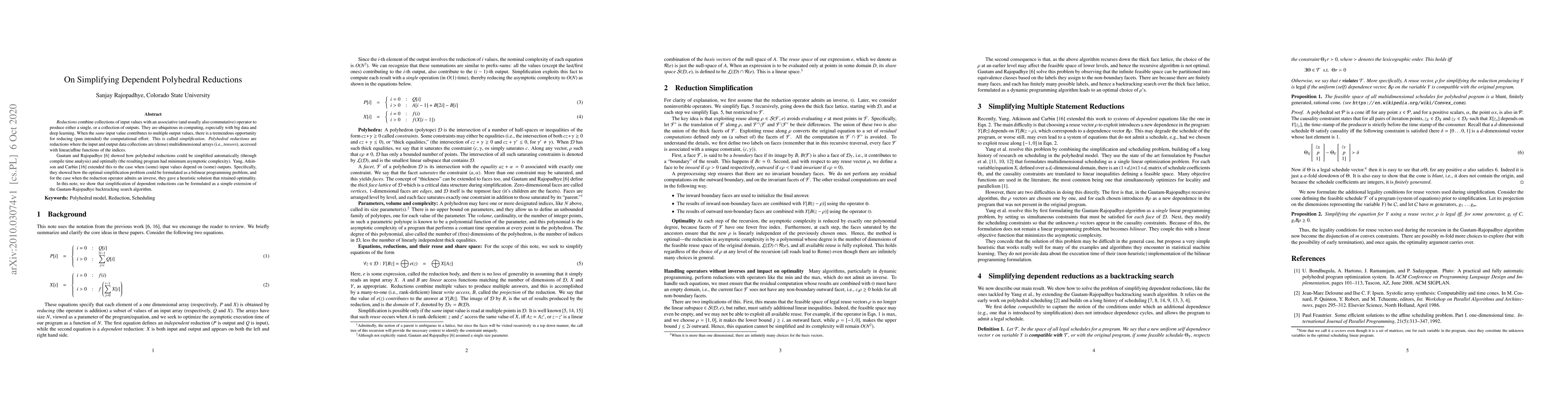 \emph{Reductions} combine collections of input values with an associative (and usually also commutative) operator to produce either a single, or a collection of outputs. They are ubiquitous in computing, especially with big data and deep learning. When the \emph{same} input value contributes to multiple output values, there is a tremendous opportunity for reducing (pun intended) the computational effort. This is called \emph{simplification}. \emph{Polyhedral reductions} are reductions where the input and output data collections are (dense) multidimensional arrays (i.e., \emph{tensors}), accessed with linear/affine functions of the indices. % \emph{generalized tensor contractions} Gautam and Rajopadhye \cite{sanjay-popl06} showed how polyhedral reductions could be simplified automatically (through compile time analysis) and optimally (the resulting program had minimum asymptotic complexity). Yang, Atkinson and Carbin \cite{yang2020simplifying} extended this to the case when (some) input values depend on (some) outputs. Specifically, they showed how the optimal simplification problem could be formulated as a bilinear programming problem, and for the case when the reduction operator admits an inverse, they gave a heuristic solution that retained optimality. In this note, we show that simplification of dependent reductions can be formulated as a simple extension of the Gautam-Rajopadhye backtracking search algorithm.