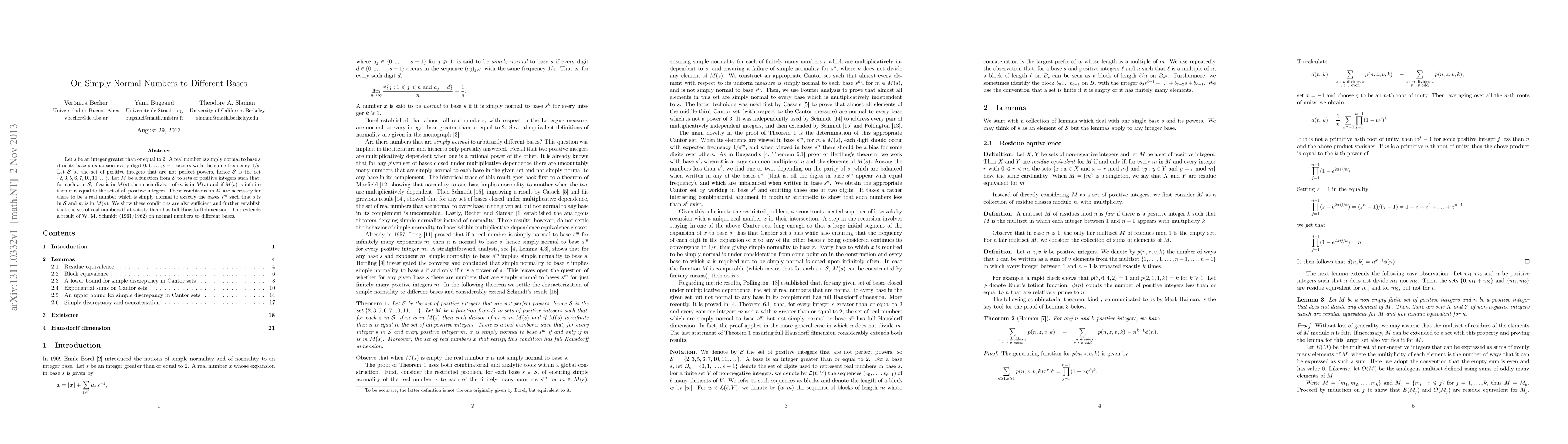 Let s be an integer greater than or equal to 2. A real number is simply normal to base s if in its base-s expansion every digit 0, 1, ..., s-1 occurs with the same frequency 1/s. Let X be the set of positive integers that are not perfect powers, hence X is the set {2,3, 5,6,7,10,11,...} . Let M be a function from X to sets of positive integers such that, for each s in X, if m is in M(s) then each divisor of m is in M(s) and if M(s) is infinite then it is equal to the set of all positive integers. These conditions on M are necessary for there to be a real number which is simply normal to exactly the bases s^m such that s is in X and m is in M(s). We show these conditions are also sufficient and further establish that the set of real numbers that satisfy them has full Hausdorff dimension. This extends a result of W. M. Schmidt (1961/1962) on normal numbers to different bases.