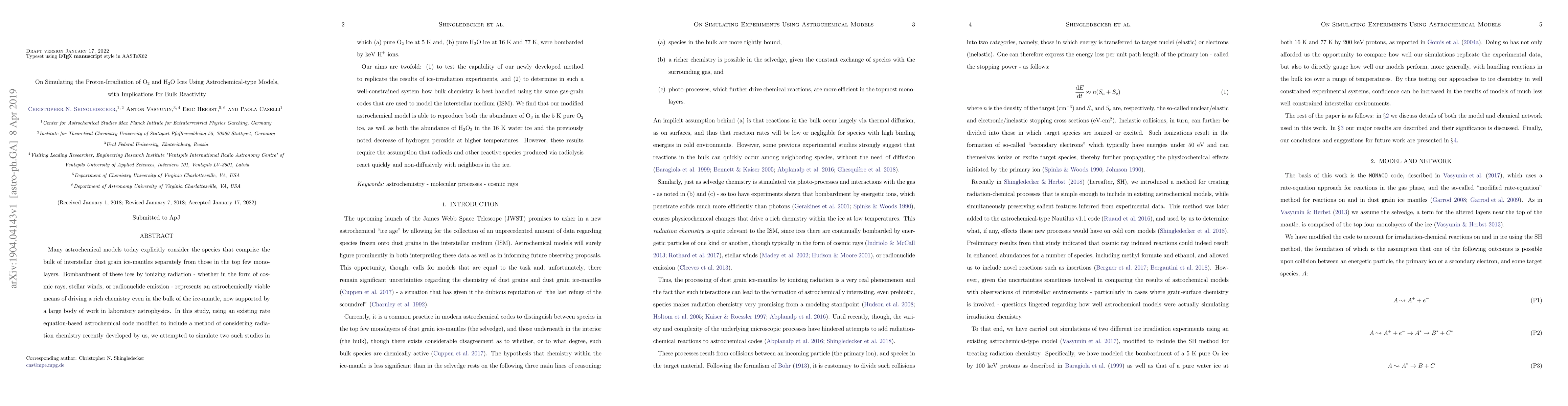 This paper simulates the proton-irradiation of O$_2$ and H$_2$O ices using an astrochemical model, finding that the model can replicate experimental results regarding the formation of O$_3$ and H$_2$O$_2$. The study highlights the importance of rapid, non-diffusive reactions of radicals in the bulk ice for accurate modeling.