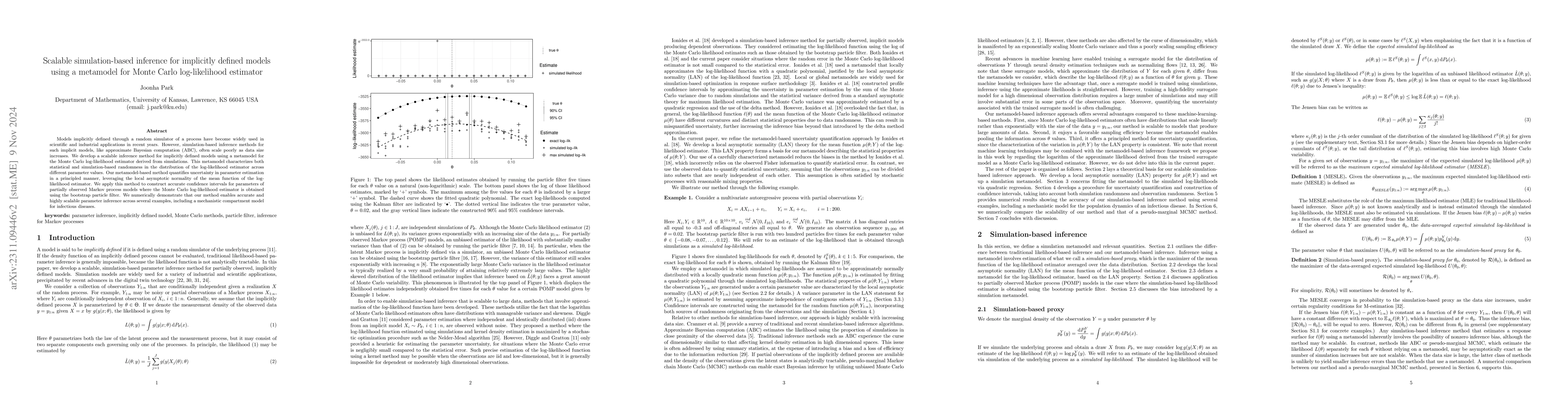 In many applications, a stochastic system is studied using a model implicitly defined via a simulator. We develop a simulation-based parameter inference method for implicitly defined models. Our method differs from traditional likelihood-based inference in that it uses a metamodel for the distribution of a log-likelihood estimator. The metamodel is built on a local asymptotic normality (LAN) property satisfied by the simulation-based log-likelihood estimator under certain conditions. A method for hypothesis test is developed under the metamodel. Our method can enable accurate parameter estimation and uncertainty quantification where other Monte Carlo methods for parameter inference become highly inefficient due to large Monte Carlo variance. We demonstrate our method using numerical examples including a mechanistic model for the population dynamics of infectious disease.