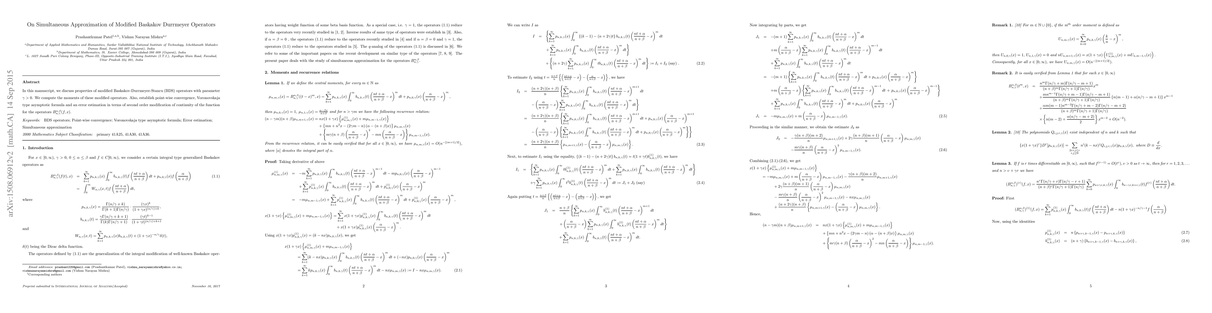 This paper explores modified Baskakov-Durrmeyer-Stancu (BDS) operators with parameter $\gamma>0$, computing their moments and establishing point-wise convergence, a Voronovskaja type asymptotic formula, and error estimation based on second-order continuity modifications.