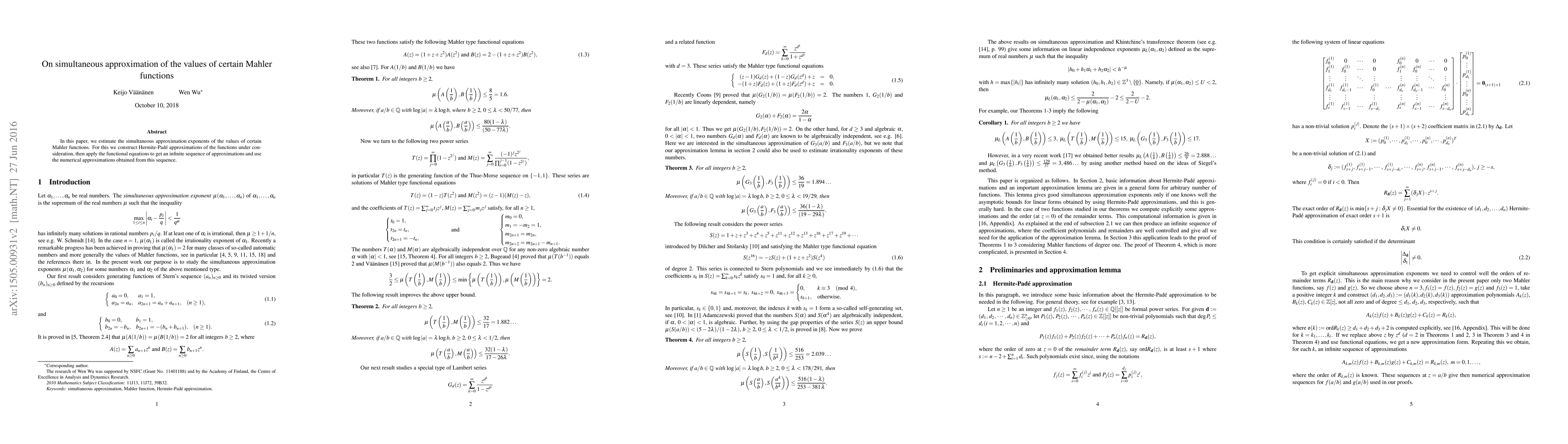 Researchers estimate simultaneous approximation exponents of certain Mahler functions using Hermite-Padé approximations and functional equations, providing a new approach to understanding these complex mathematical objects.