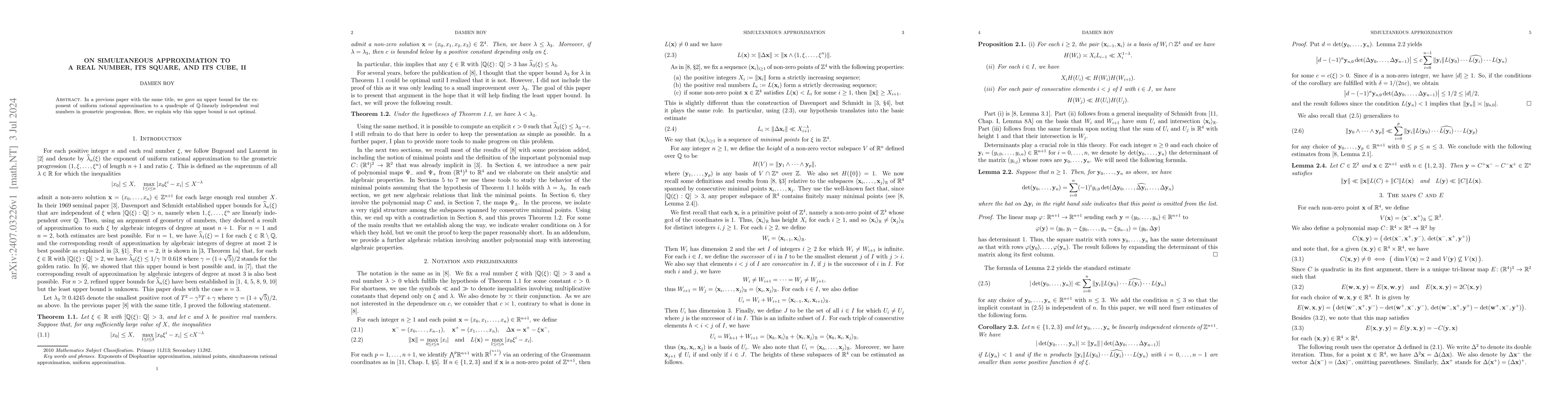 Summary: This paper discusses the optimality of an upper bound previously established for uniform rational approximation to a quadruple of $\mathbb{Q}$-linearly independent real numbers in geometric progression, concluding that the bound is not optimal.