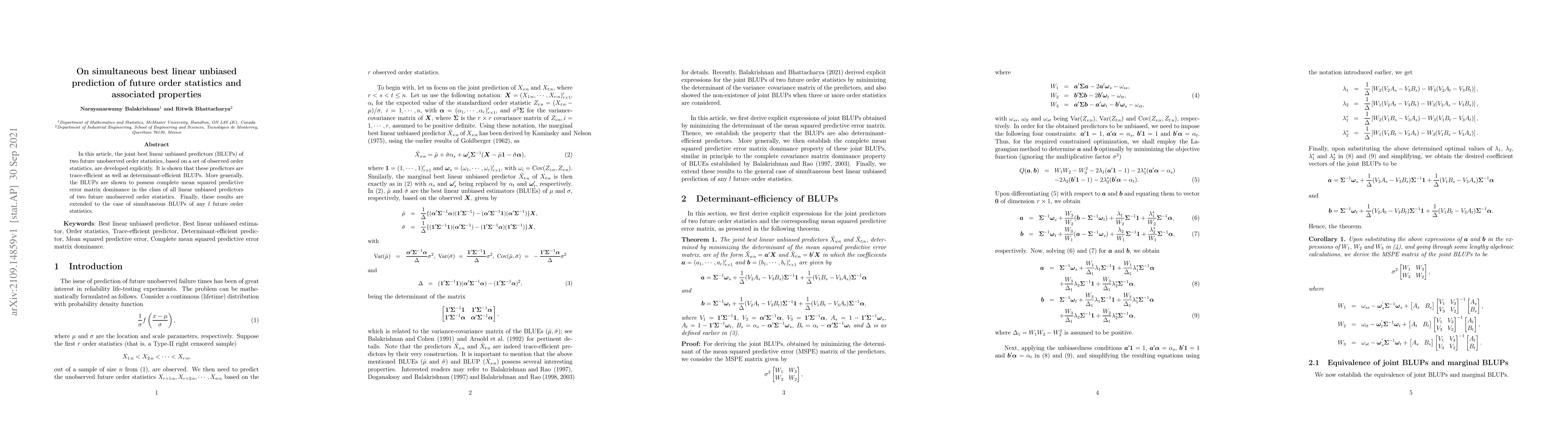 In this article, the joint best linear unbiased predictors (BLUPs) of two future unobserved order statistics, based on a set of observed order statistics, are developed explicitly. It is shown that these predictors are trace-efficient as well as determinant-efficient BLUPs. More generally, the BLUPs are shown to possess complete mean squared predictive error matrix dominance in the class of all linear unbiased predictors of two future unobserved order statistics. Finally, these results are extended to the case of simultaneous BLUPs of any $l$ future order statistics.