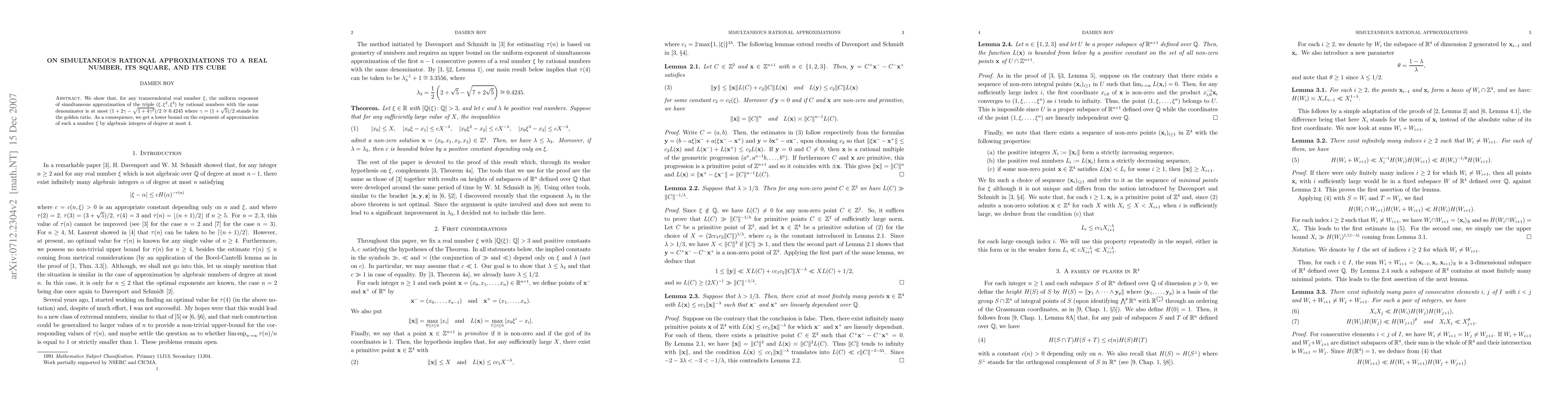 This paper establishes an improved upper bound on the uniform approximation of a transcendental real number, its square, and its cube by rational numbers sharing the same denominator. It also yields a sharper lower bound on the approximation of such numbers by algebraic integers of degree up to 4.
