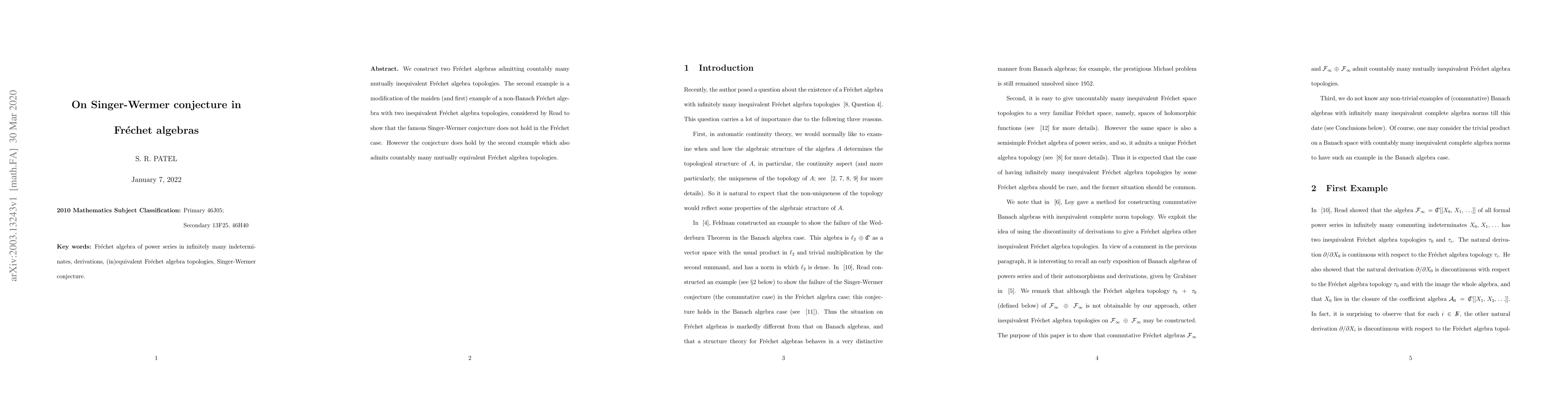 This paper constructs two Frechet algebras demonstrating countably many inequivalent Frechet topologies, with the second example refuting the Singer-Wermer conjecture in Frechet algebras while the first does not. The conjecture holds true for the second example, which also supports countably many equivalent topologies.