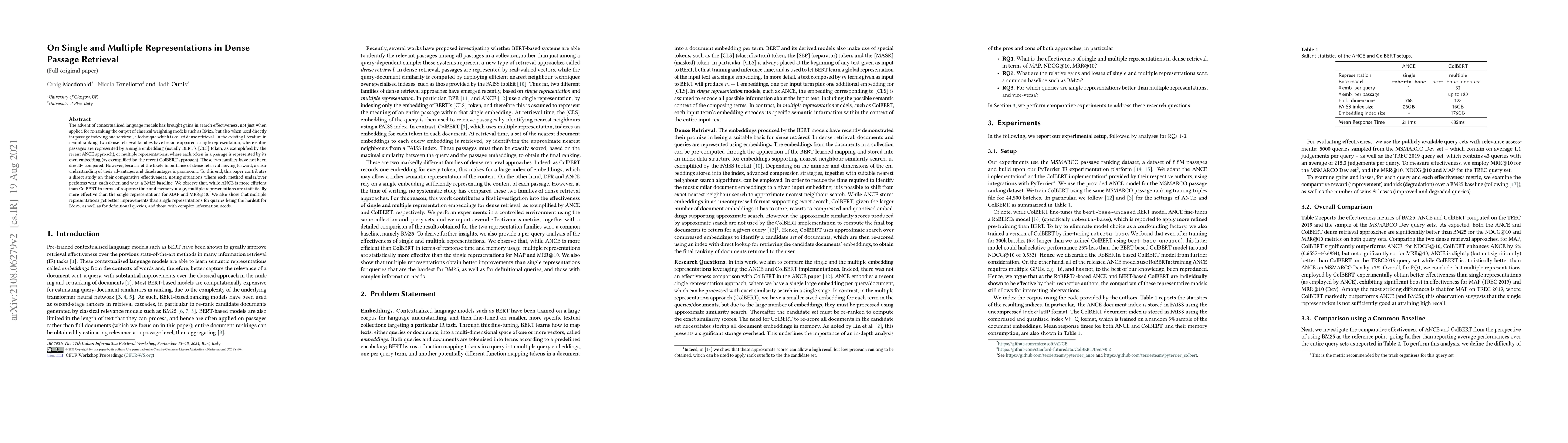 This paper compares single and multiple representation approaches in dense passage retrieval, finding that while single representations (e.g., BERT's [CLS] token) are more efficient, multiple representations (e.g., ColBERT) outperform them in terms of retrieval effectiveness, especially for complex queries.